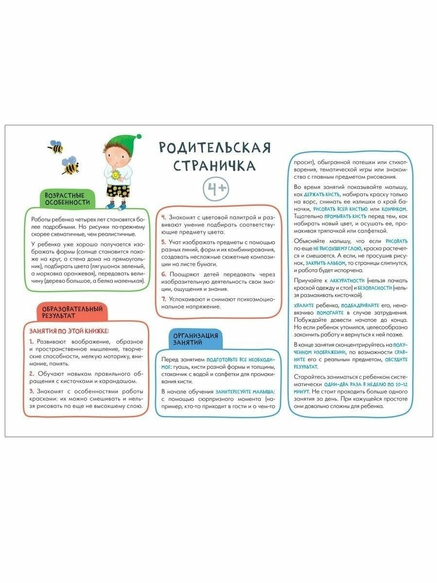 Книга «Рисуем красками 4+» из серии «Школа Семи Гномов. Мастерская» — это красочный альбом для занятий рисованием с ребенком от 4 до 5 лет. Занятия на близкие и понятные ребенку темы расположены по мере усложнения: поступательно переходя от освоения простых навыков к более сложным заданиям, ребенок научится создавать рисунки с помощью красок и кисточки.