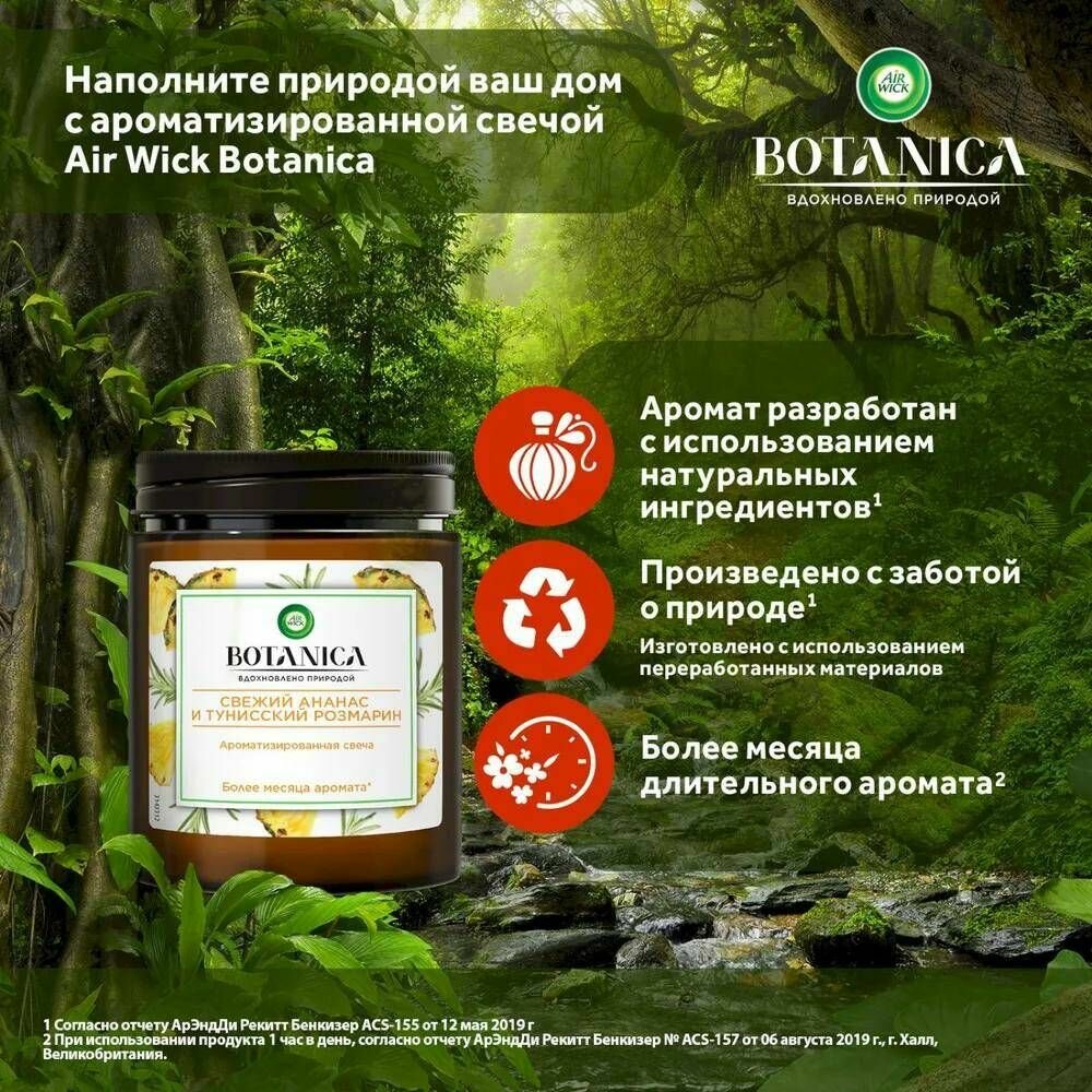 AirWick Botanica ароматизированная свеча Свежий ананас и тунисский розмарин. Ароматы Botanica изготовлены из натуральных ингредиентов, тщательно собранных с заботой об окружающей среде. Ароматизированная свеча Air Wick Botanica наполнит природой ваш дом, позволяя насладиться длительным деликатным ароматом нежной ванили в сочетании с теплыми нотками гималайской магнолии.