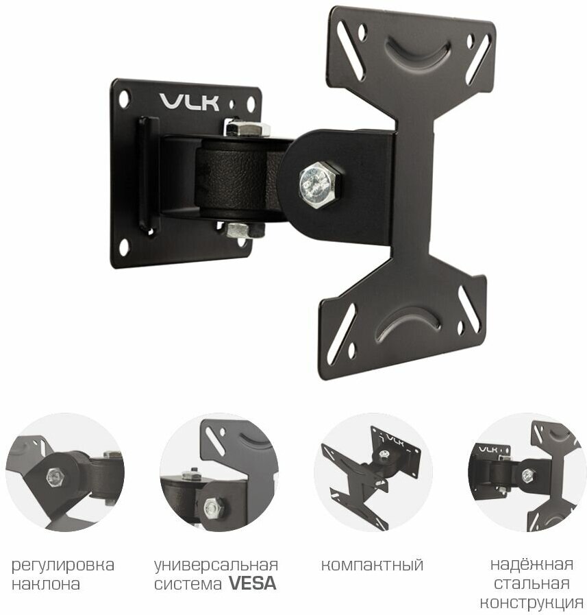 Универсальный наклонно-поворотный кронштейн VLK подходит для большинства LCD/LED телевизоров с диагональю экрана 15-32 дюймов (38-81см) и максимальным весом 15 кг. Конструкция кронштейна VLK позволяет поворачивать экран влево/вправо на 90° и изменять угол наклона вверх/вниз на 20°. Установленный на кронштейне телевизор будет располагаться в 100 мм от стены. Благодаря широкому настенному основанию с четырьмя точками крепления, кронштейн VLK можно установить на любую стену – кирпич, железобетон, дерево и даже гипсокартонные перекрытия. Для удобства монтажа на стену, в кронштейне предусмотрена съёмная монтажная пластина. В комплект поставки входят все необходимые крепежи и инструкция по установке.