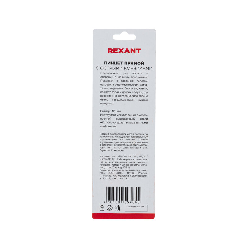 Пинцет прямой с острыми кончиками 125 мм REXANT предназначен для манипуляции маленькими предметами, которые невозможно, неудобно, либо нежелательно или опасно брать незащищенными руками.