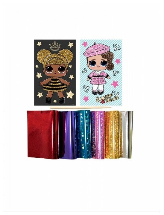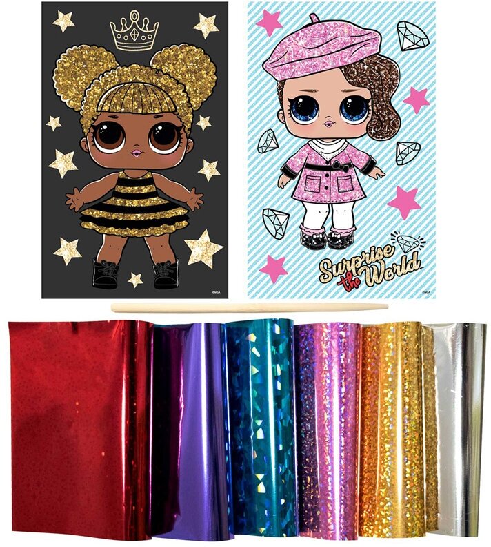 Творческий набор в стиле LOL Surprise с изображением куколок и аксессуаров. Используйте разноцветную фольгу и стилус, чтобы нанести ее на прическу, одежду и аксессуары куколки.