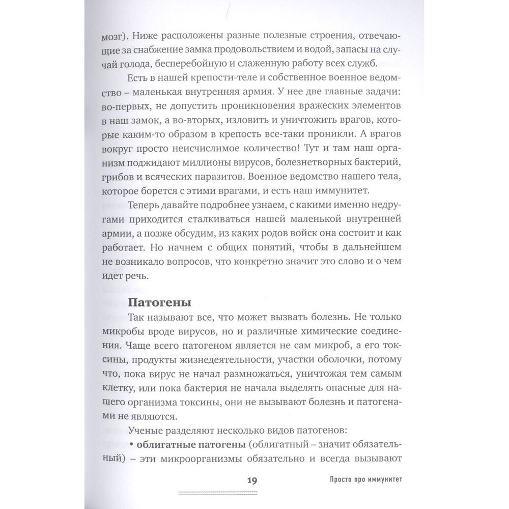 Шикарная книга! Вот прям лучшая на эту тему. Все понятно, подробно, много практических простых советов, которые легко воплотить в жизнь. Порадовало то, что не нужно постоянно гуглить новые слова, что у меня было при прочтении других книг про иммунитет, написанных именитыми учеными. Они не спешили разъяснять им понятные термины, неизвестные обычному человеку. Здесь же автор все понятно излагает, каждый новый термин объясняет простыми словами. Очень понятная и простая для понимания книга - собственно что следует из названия "Просто про иммунитет". Очень советую всем прочесть для общего развития!