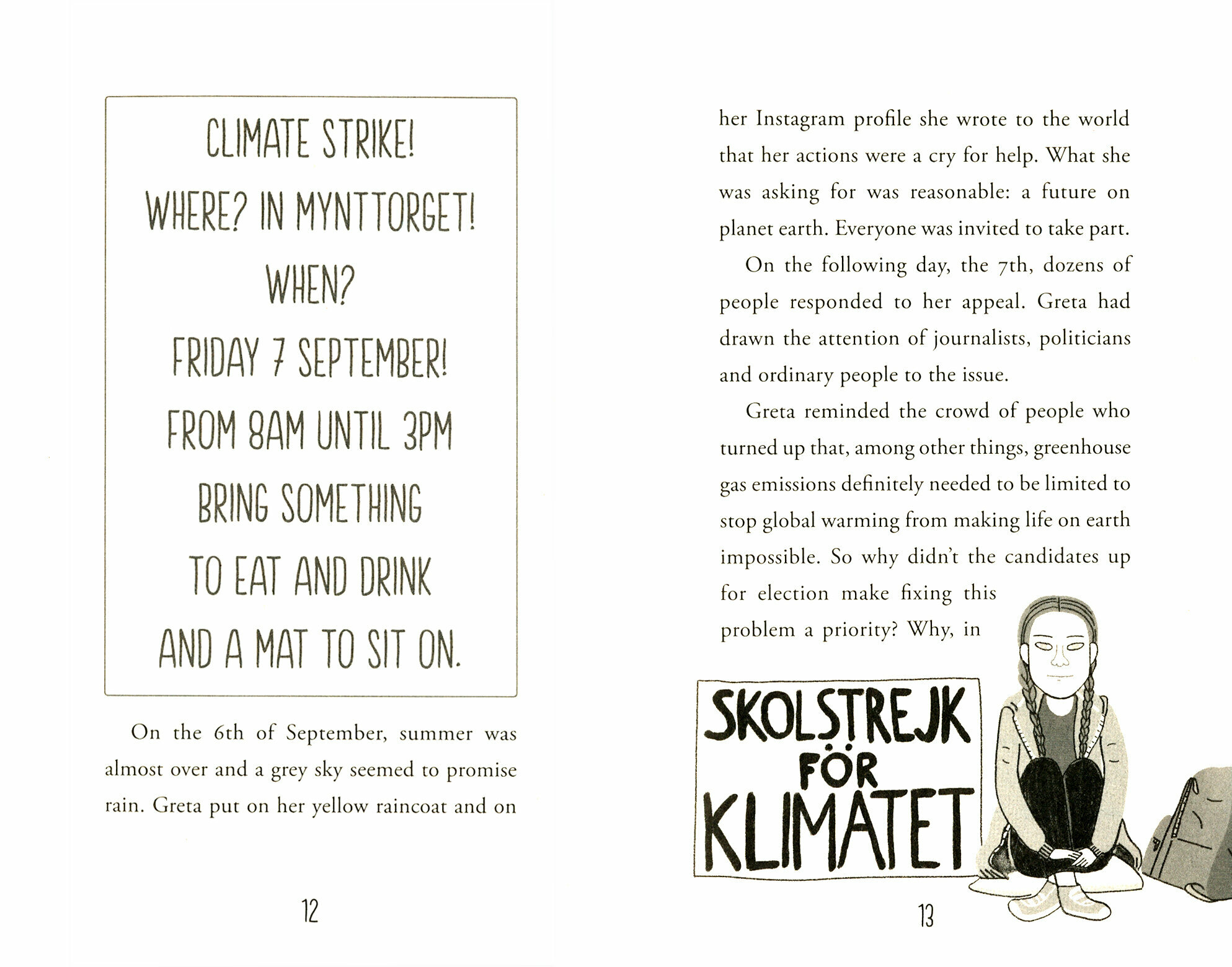 It’s 20 August 2018, late summer in Stockholm, and it feels incredibly hot in the city. The TV news reports rising temperatures, and there have been numerous fires throughout Sweden. Fifteen-year-old Greta Thunberg decides she can’t wait any longer: politicians have to do something to save the environment. Instead of returning to school, Greta takes a placard and goes on strike in front of Sweden’s parliament building.