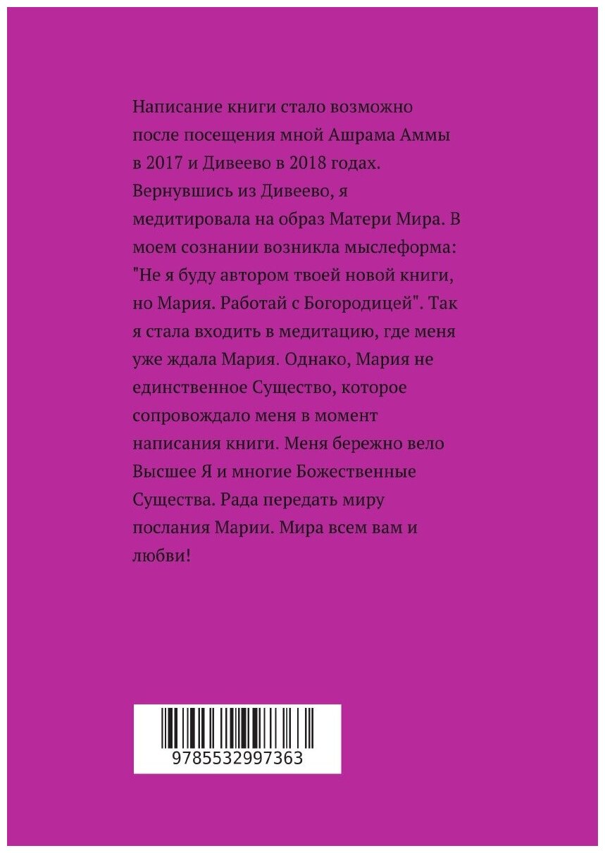Написание книги стало возможно после посещения мной Ашрама Аммы в 2017 и Дивеево в 2018 годах. Вернувшись из Дивеево, я медитировала на образ Матери Мира. В моем сознании возникла мыслеформа: "Не я буду автором твоей новой книги, но Мария. Работай с Богородицей". Так я стала входить в медитацию, где меня уже ждала Мария. Однако, Мария не единственное Существо, которое сопровождало меня в момент написания книги. Меня бережно вело Высшее Я и многие Божественные Существа. Рада передать миру послания Марии. Мира всем вам и любви!
