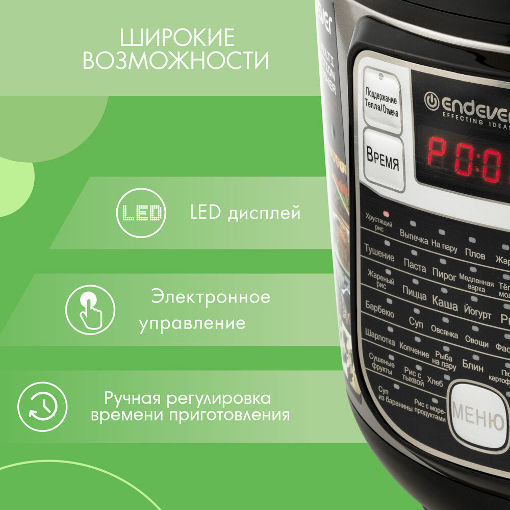 Мультиварка ENDEVER – новая функциональная модель мультиварки в прочном металлическом корпусе, с 45 автоматическими программами. Кроме того, ручная регулировка времени дает массу возможностей для приготовления различных блюд, наличие контейнера-пароварки в комплекте, оптимальная мощность мультиварки (1000 Вт), в сочетании с 45 программами приготовления, вместительностью (5 л) – находка для любого покупателя, который желает приобрести многофункциональный прибор. Полезные дополнения — функции поддержания тепла и отложенного старта