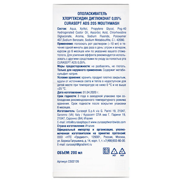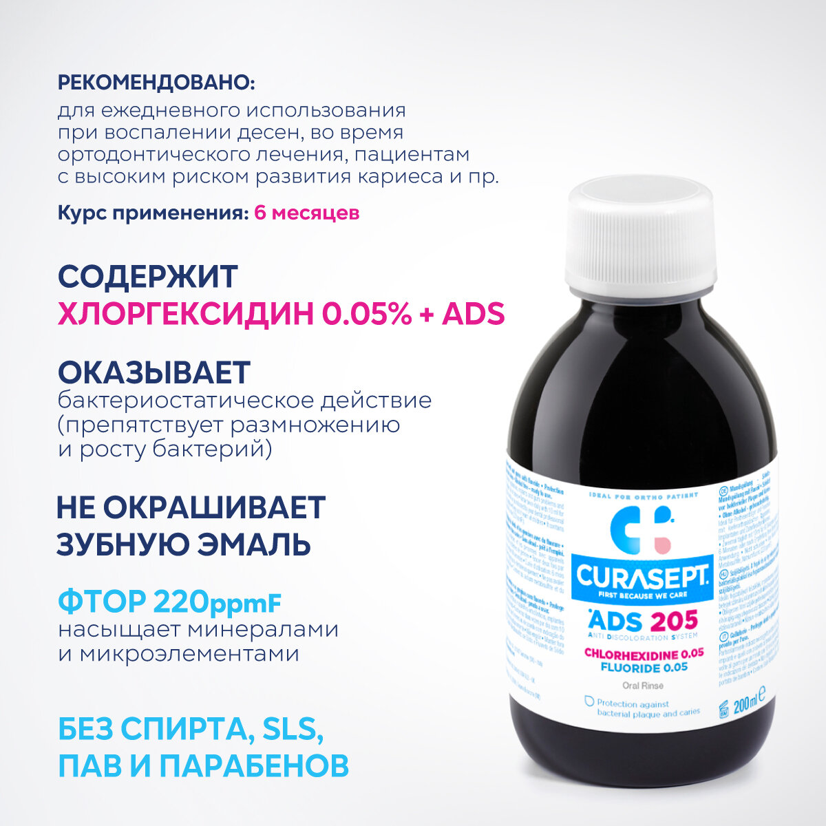 | Применение | применять 2 раза в день в течение нескольких месяцев (до 6 месяцев). Полоскать в течение примерно 1 минуты 1 столовой ложкой неразбавленного продукта (10 мл) после приема пищи и после чистки зубов пастой без SLS. Рекомендуется комбинировать с зубной пастой ADS. |