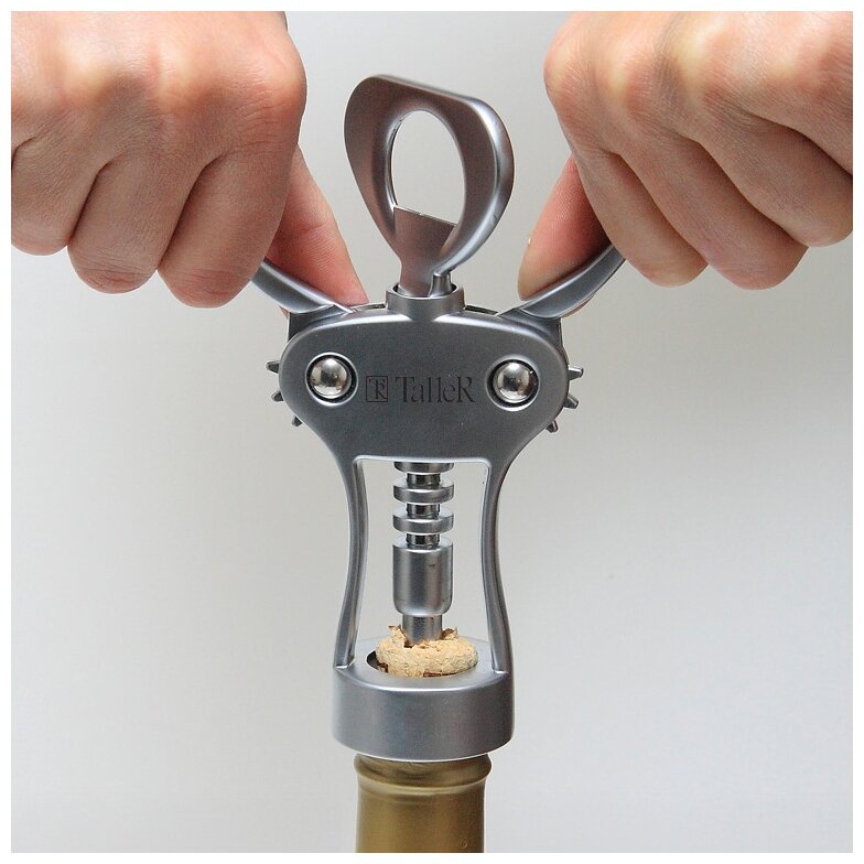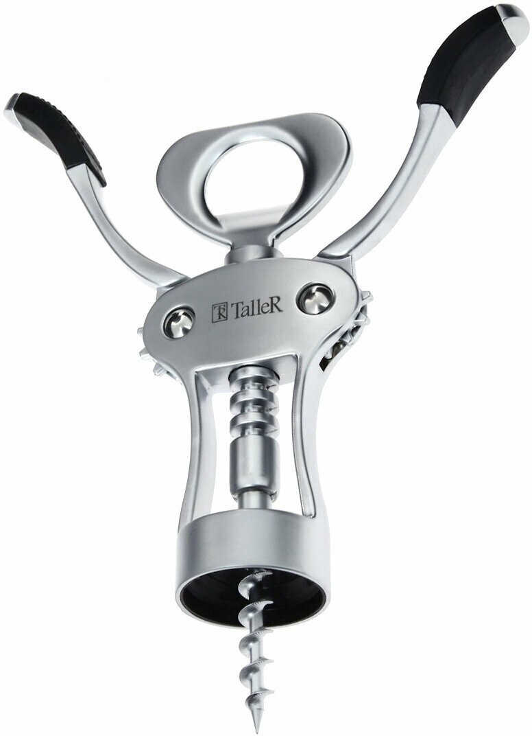 Штопор TalleR Выполнен из хромированного цинкового сплава.Спираль штопора выполнена из высококачественной хромированной стали и снабжена защитным колпачком.Обращаем внимание, что верхняя часть штопора НЕ предназначена для открывания бутылок.