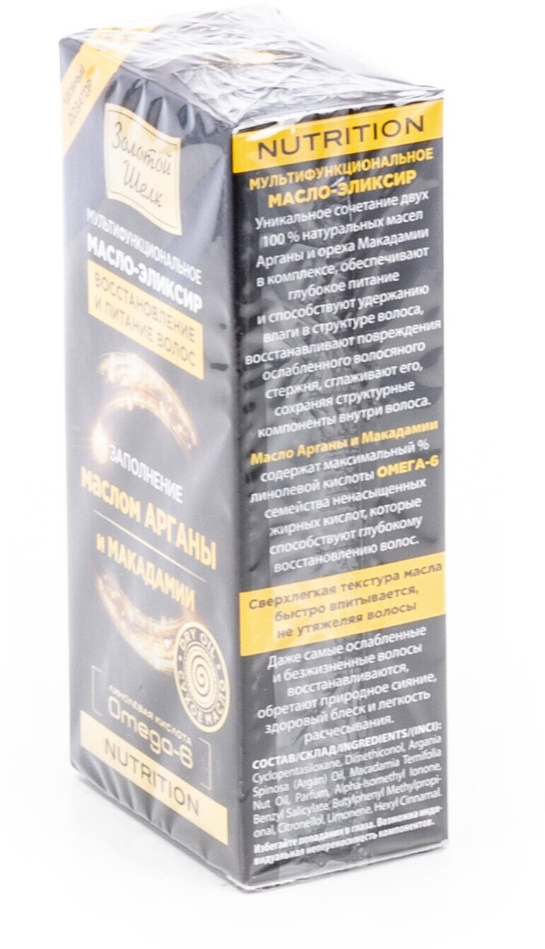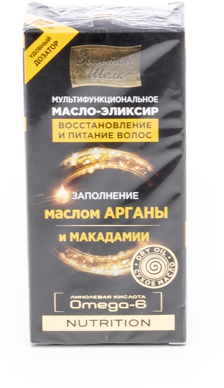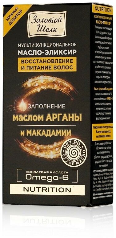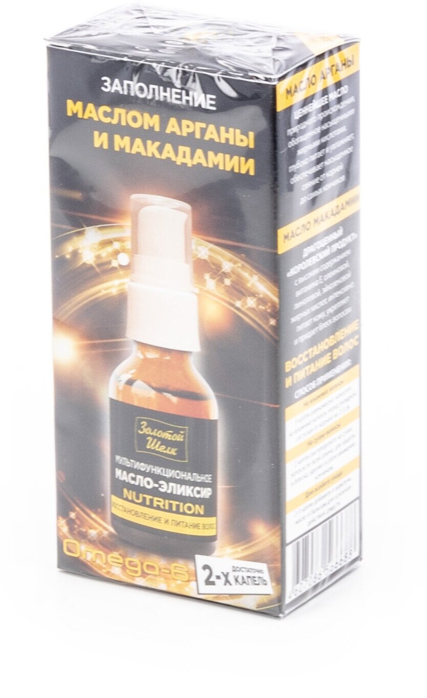 Масло для волос Золотой шелк уникальное имеет сочетание двух 100 % натуральных масел Арганы и ореха Макадамии в комплексе, которые обеспечивают глубокое питание и способствуют удержанию влаги в структуре волоса, восстанавливают повреждения ослабленного волосяного стержня, сглаживают его, сохраняя структурные компоненты внутри волоса.