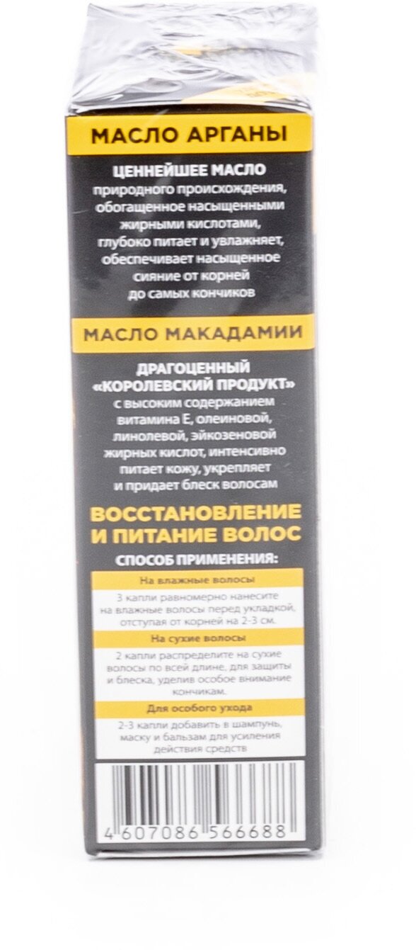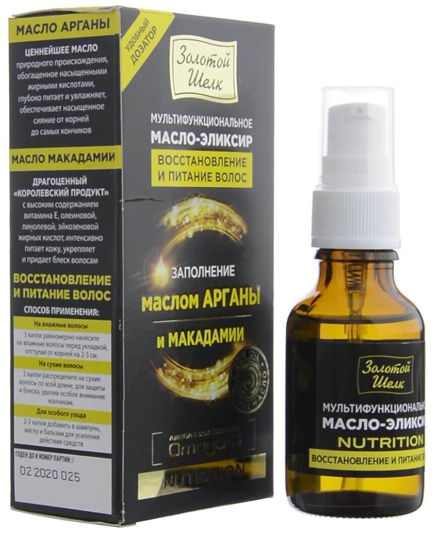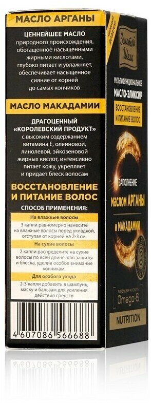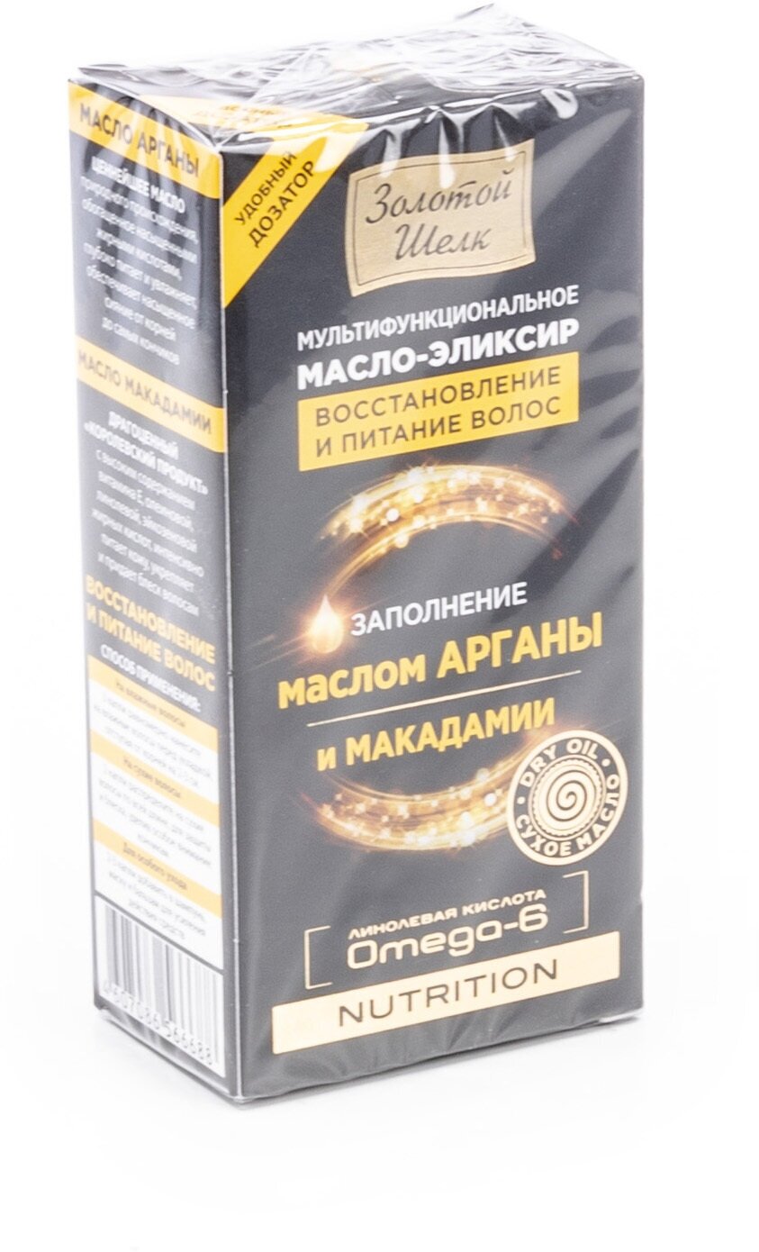 Масло для волос Золотой шелк уникальное имеет сочетание двух 100 % натуральных масел Арганы и ореха Макадамии в комплексе, которые обеспечивают глубокое питание и способствуют удержанию влаги в структуре волоса, восстанавливают повреждения ослабленного волосяного стержня, сглаживают его, сохраняя структурные компоненты внутри волоса.