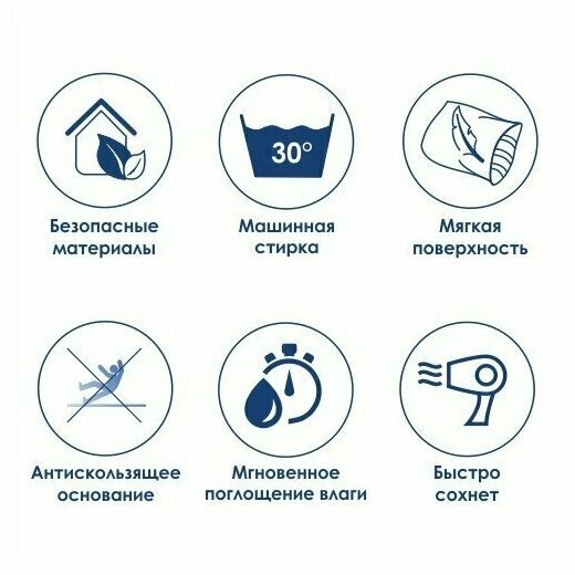 Однотонные коврики выполнены из латекса, и коврики с дизайнерским рисунком - из полиамида с высотой ворса 13 мм. И тот, и другой материал идеально подходит для использования в ванной комнате. Они моментально впитывают влагу, а также быстро сохнут. Машинная стирка. За изделиями легко ухаживать. Их можно стирать в стиральной машинке. Но главное всегда соблюдать режим: коврики из латекса можно стирать при температуре не выше 30 градусов, а коврики из полиамида - при температуре не выше 30 градусов и исключительно в режиме бережной стирки. Антискользящее основание. Антискользящее основание выполнено из резины или латекса, в зависимости от коллекции. Основание препятствует скольжению изделия, а это значит, что и Вы будете прочно стоять на ногах. Мгновенное поглощение влаги. Коврики для ванной комнаты моментально впитывают влагу.