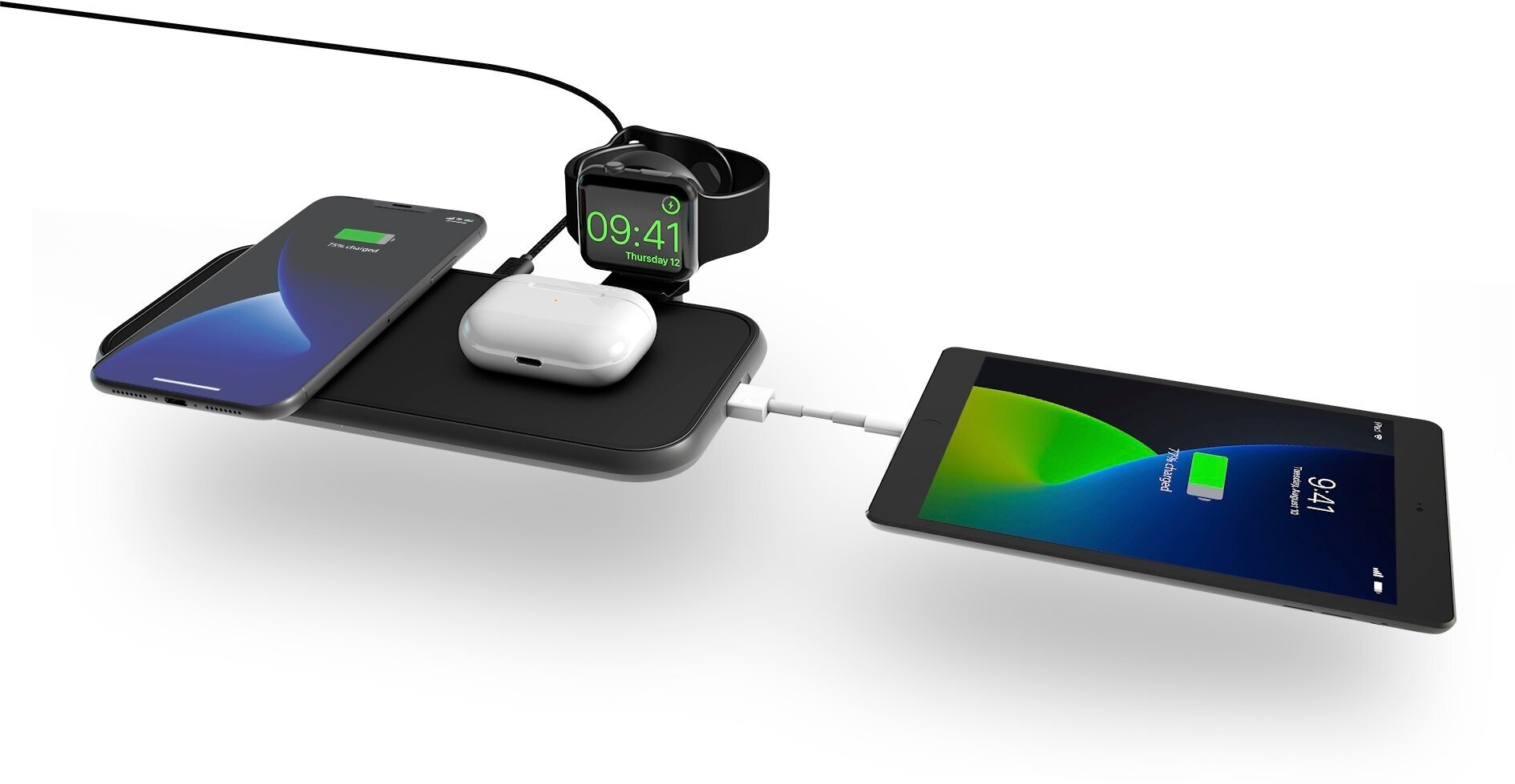 Во встроенный держатель Apple Watch можно легко встроить зарядный кабель Apple Watch MFi (входит в комплект). Подключите его к порту USB-A на задней панели зарядного устройства и поместите Apple Watch на модуль зарядки, чтобы начать зарядку. Встроенный порт USB-A на боковой стороне зарядного устройства позволяет заряжать четвертое устройство, например iPad или любое другое устройство с питанием от USB-A. Зарядное устройство изготовлено из высококачественного алюминия и поставляется с универсальным адаптером питания USB-C PD мощностью 45 Вт.