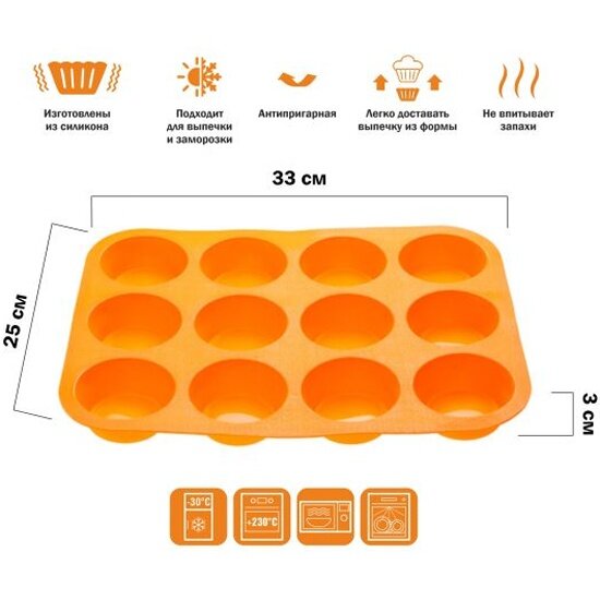 Форма для выпечки силиконовая прямоугольная на 12 кексов 33х25х3 см оранжевая служит для приготовления кексов и других видов выпечки, также подходит для заморозки.Возможно использование во всех типах печей, исключением являются печи с открытым огнем и функцией гриль.Отличается противоприлипающим и антипригарным свойствами, что позволяет готовить без добавления масла и гарантирует простоту очистки.Безопасна для здоровья.