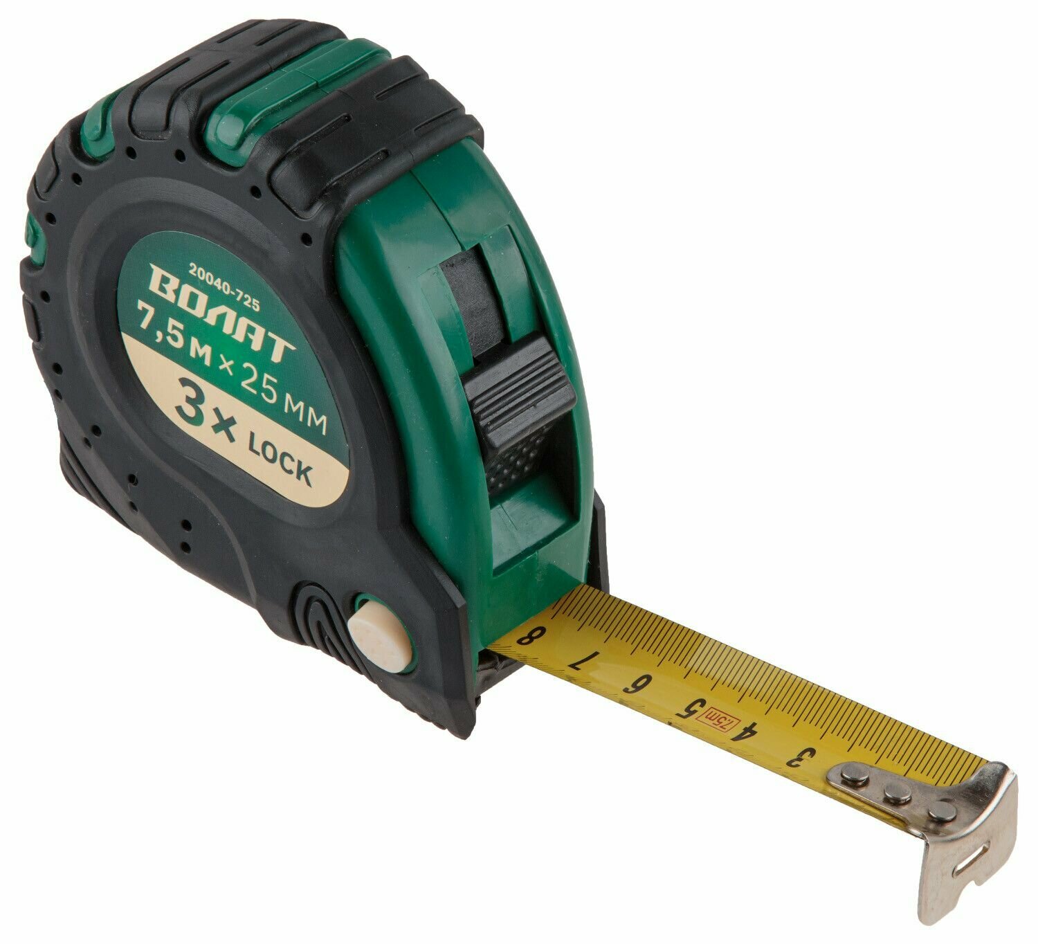 Рулетка "ВОЛАТ" - это удобный измерительный инструмент, который используется в профессиональных мастерских и в домашних условиях для определения размеров объектов и предметов.Преимущества Корпус рулетки изготовлен из современного ABS-пластика и снабжен обрезиненным чехлом Эргономичное устройство рулетки включает три независимых механизма фиксирования ленты, что делает работу с рулеткой наиболее удобной Рулетка также устойчива к ударам из-за падения с высоты Лента легко и быстро сматывается - это позволяет достичь высокой эффективности и скорости в измерениях