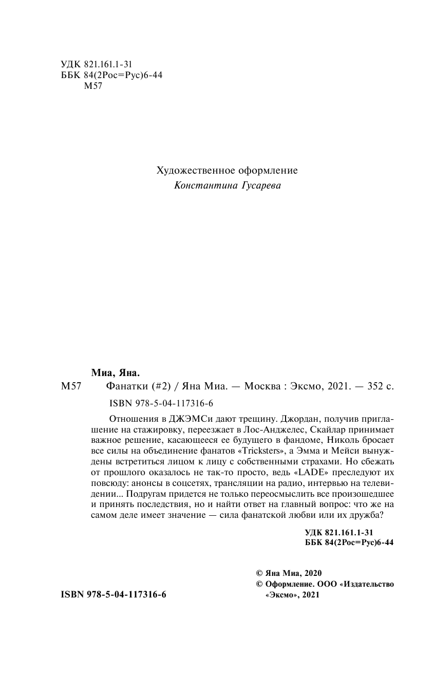 Наконец-то продолжение любимого романа «Фанатки»! Теперь «Фанатки-2» — это реально как второй сезон захватывающего сериала. И в новой части все еще интереснее, чем в предыдущей. Снова Яна Миа мастерски погружает читателя в кулуары фанатской жизни, которая поражает своей многогранностью, многочисленными событиями, переживаниями. Там и истории дружбы, и любви, и новые незнакомые эмоции из мира музыки и гастрольных туров. Герои, с которыми за первую часть практически срастаешься вновь выходят на авансцену, только теперь всё в их жизни меняется. Скайлар, кажется, решила повзрослеть, ещё двум девчонкам, Мейси и Эмме надо будет разобраться со своими фобиями и проблемами прошлого. Короче говоря, невероятно насыщенная жизнь, которая увлечет любого читателя с первой страницы и не отпустит до самого финала. Всем рекомендую!