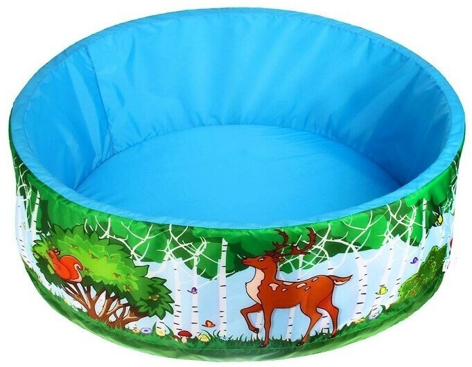 Сухой бассейн «Зверята» синего цвета, в дизайне забавные зверушки и деревья. Это достаточно компактный элемент интерьера, он не займет много места в помещении.