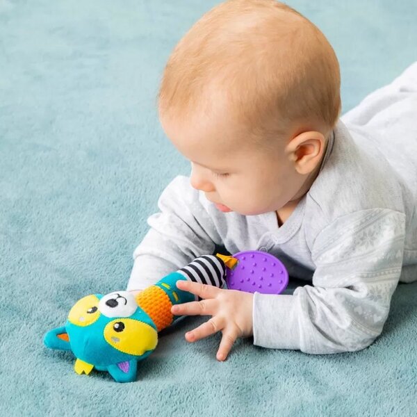 Внутри туловища этого милого енотика спрятана звонкая пищалка. Она будет веселить маленького непоседу каждый раз, когда он будет сжимать игрушку своей маленькой ручкой. Забавный звук пищалки поспособствует развитию у крохи хватательного рефлекса, ведь ему будет хотеться нажимать на игрушку снова и снова! На конце изделия прикреплён фактурный прорезыватель из мягкого силикона, который обязательно пригодится малышу, когда у него начнут расти первые зубки.