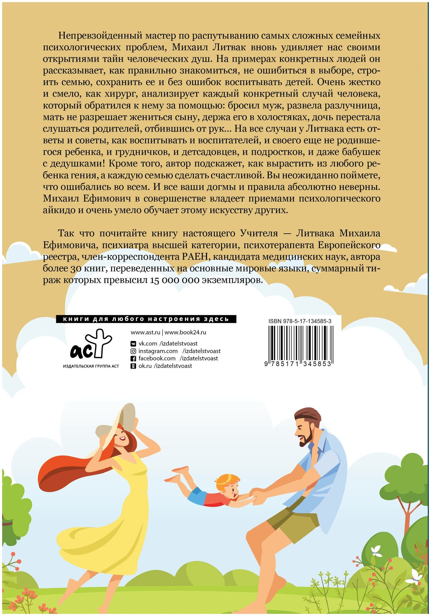 Непревзойденный мастер по распутыванию самых сложных семейных психологических проблем, Михаил Литвак вновь удивляет нас своими открытиями тайн человеческих душ. На примерах конкретных людей он рассказывает, как правильно знакомиться, не ошибиться в выборе, строить семью, сохранить ее и без ошибок воспитывать детей. Очень жестко и смело, как хирург, анализирует каждый конкретный случай человека, который обратился к нему за помощью: бросил муж, развела разлучница, мать не разрешает жениться сыну, держа его в холостяках, дочь перестала слушаться родителей, отбившись от рук... На все случаи у Литвака есть ответы и советы, как воспитывать и воспитателей, и своего еще не родившегося ребенка, и грудничков, и детсадовцев, и подростков, и даже бабушек с дедушками! Кроме того, автор подскажет, как вырастить из любого ребенка гения, а каждую семью сделать счастливой. Вы неожиданно поймете, что ошибались во всем. И все ваши догмы и правила абсолютно неверны. Михаил Ефимович в совершенстве владеет приемами психологического айкидо и очень умело обучает этому искусству других.