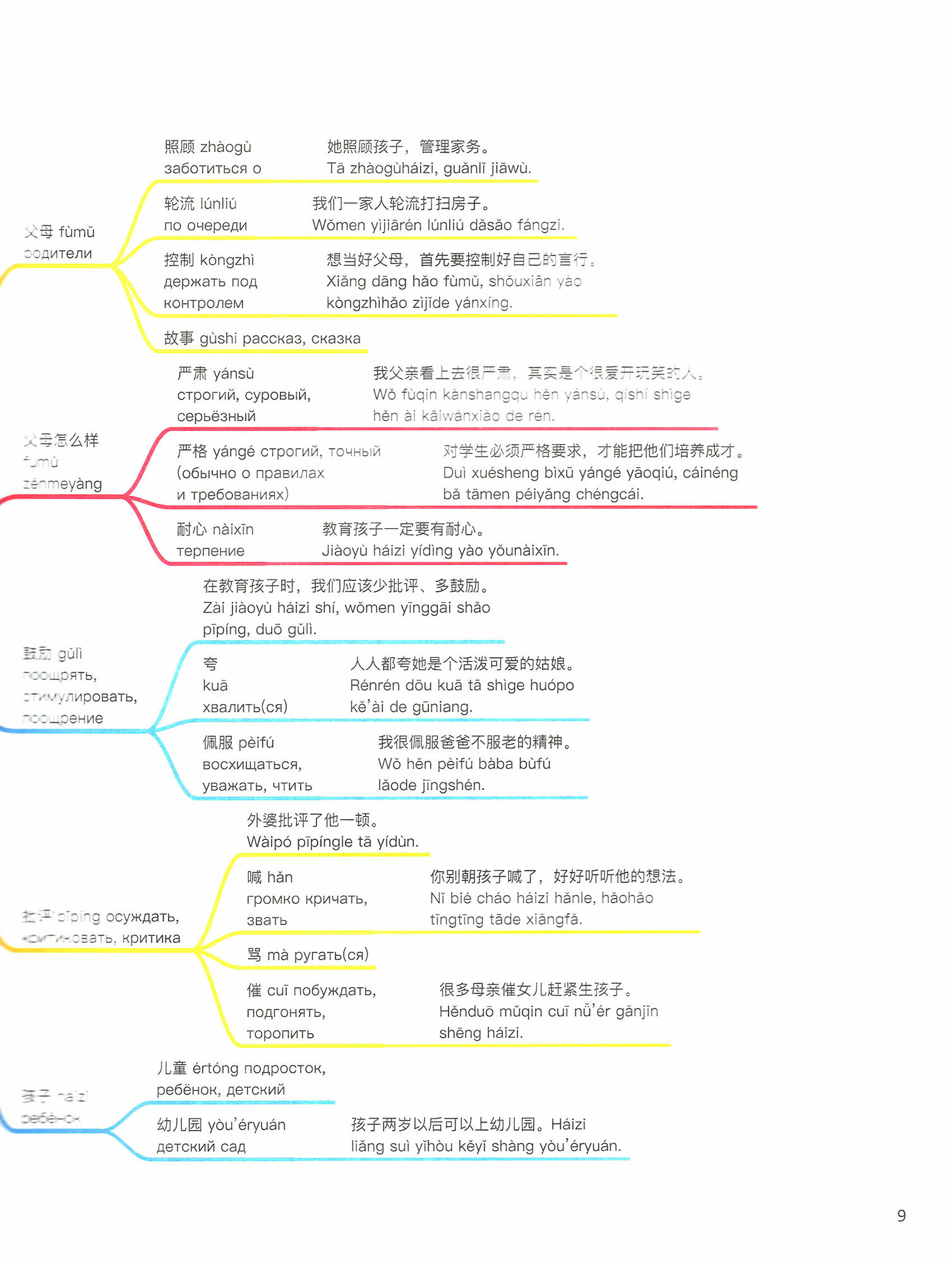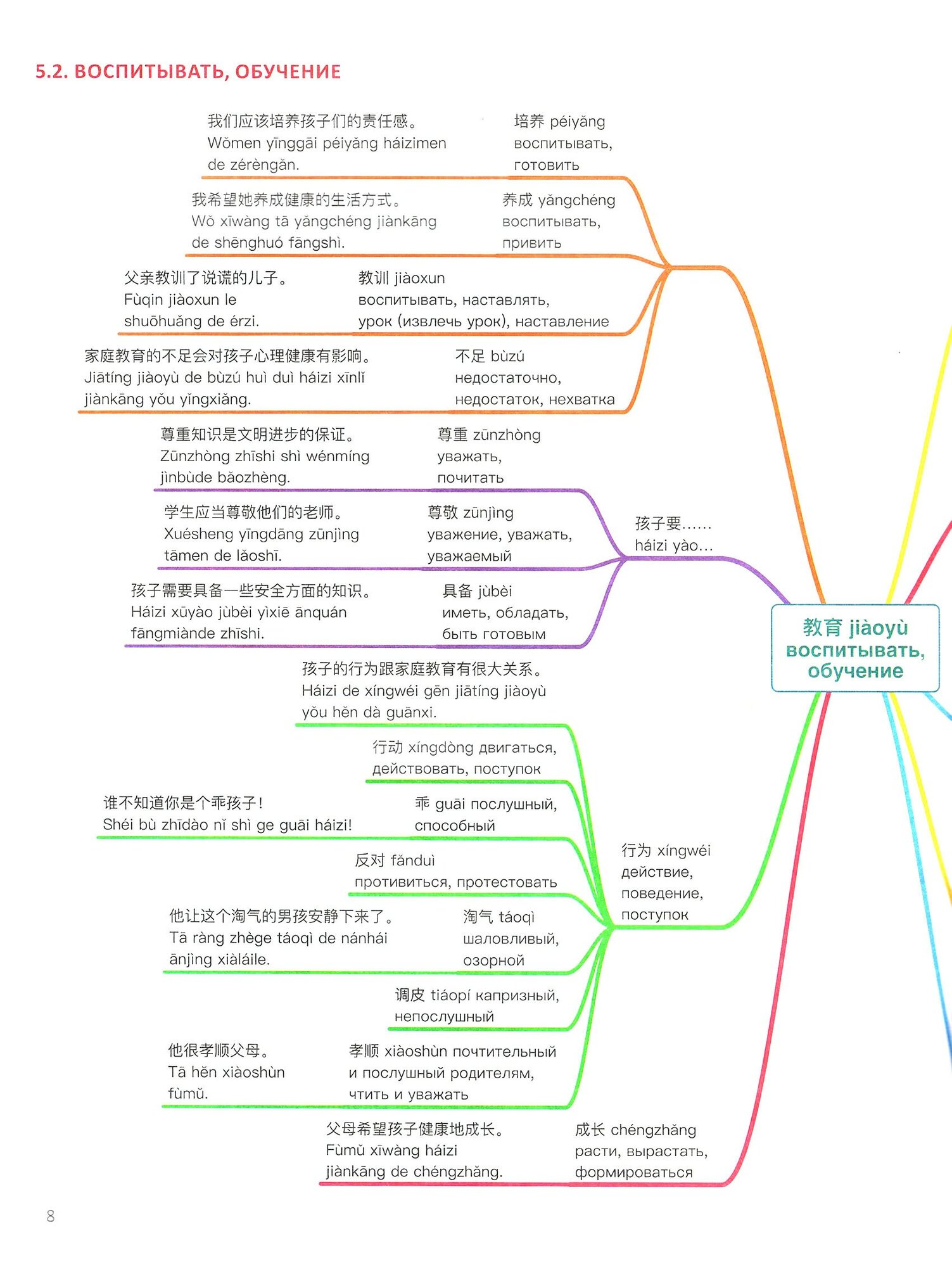 Начав подготовку к 5 уровню HSK, я столкнулась с бескрайним морем слов. Чтобы изучение было не таким сложным и созданы эти схемы-паутинки. Если учить слова просто по списку, то мы не улавливаем взаимосвязей между ними. Когда же мы открываем это издание, то сразу можем понять как связать слова в предложения, а затем и в текст. К словам даны примеры употребления, что еще больше облегчает понимание.