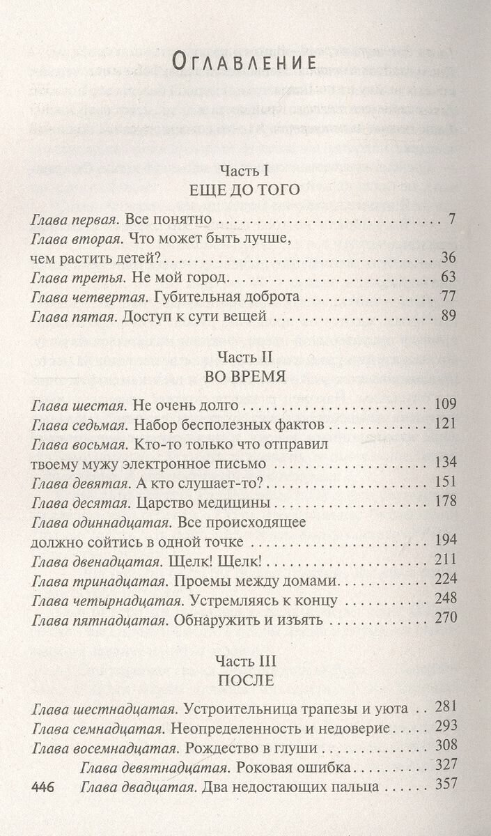Идея была интересной – мы часто ловим себя на мысли, что герой тупой и давно пора понять кто злодей, здесь эта мысль вынесена в основу, чем и зацепила, но, к сожалению, дальше дело не пошло. Большой объем текста разочаровывает, вместо описания причин, как такая умная (?) героиня-психолог, проморгала мужа-психопата, страница за страницей идет подробное описание чувств героини к той или иной вещи, предмету быта, месту, и все это никак не влияет на развитие сюжета. Да собственно, и сюжета-то как такового нет, история в двух словах растянута на целую книгу. По моему, автору самому бы не помешал психолог по причине его жуткого вещизма, к чему такие подробности про атрибуты жизни богатеньких ньюйоркцев, осталось непонятым. Главная героиня, сочувствия не вызывает, скорее глухое раздражение от своих бесконечных попыток уйти от реальности: она постоянно повторяет себе: -"Я не обязана здесь быть", -"Я просто могу уйти" и так далее, складывается впечатление, что это глупая, самовлюбленная инфантильная дама, построившая карьеру психолога, в условиях, где не построить карьеру было бы сложно, при этом от любых трудностей, неприятной правды, она стремится просто уйти, спрятать голову в песок, чем с легкостью пользовался ее муж. За разочарование от сюжета, плюс разочарование от главной героини ставлю минимальную оценку.