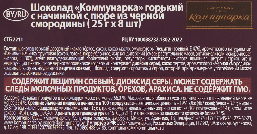 | Состав | шоколадная масса (какао тертое, сахар, какао-масло, эмульгаторы (лецитин соевый, E476), ароматизатор натуральный "ваниль"), начинка (сахар, патока, пюре яблочное (содержит консервант диоксид серы), регулятор кислотности кислота лимонная, пюре черносмородиновое (содержит консервант диоксид серы), ароматизатор "черная смородина", краситель натуральный кармин), может содержать следы молочных продуктов, орехов, яичных продуктов, глютена, содержание какао-продуктов в шоколадной массе не менее 56% |