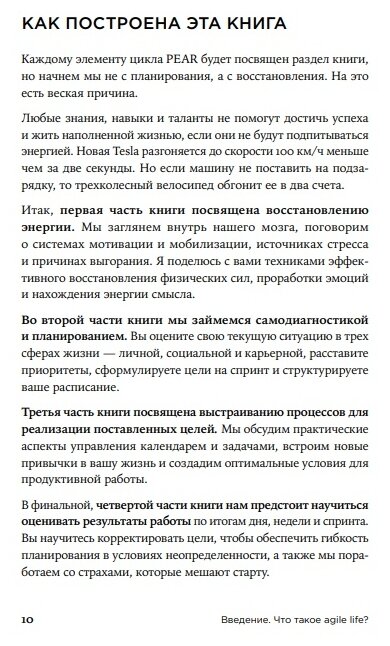 Метод agile life предполагает поэтапное движение к целям без насилия над собой и основан на новейших исследованиях в области нейрофизиологии, методах самокоучинга и использовании цикличных agile-спринтов. В нем заложена идея, что любого рода деятельность должна представлять собой регулярные циклы, состоящие из четырех элементов: Plan (планирование), Execute (реализация), Analyze (анализ) и Recharge (восстановление). Каждому элементу цикла посвящен раздел книги.