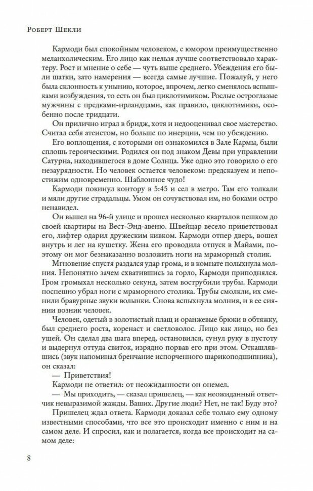 До покупки этого замечательного сборника читала у Р. Шекли только "Координаты чудес" - удивительный роман, который мне очень понравился. Решила познакомиться с другими произведениями автора. Заказала ещё другой сборник рассказов Р. Шекли, помимо этого. Эта серия книг мне очень понравилась, оформление хорошее. Увеличенный формат издания, комфортный шрифт, бумага хорошая. Жалко, что нет иллюстраций. В общем мне всё понравилось.