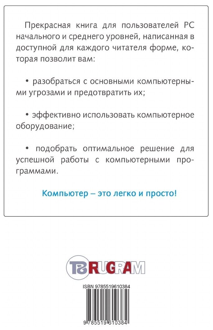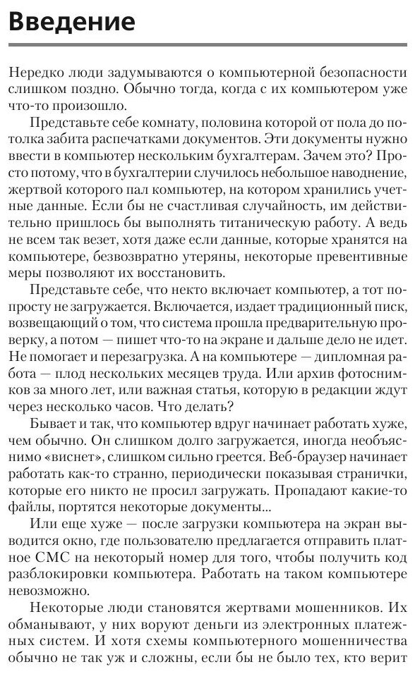 Прекрасная книга для пользователей PC начального и среднего уровней. В доступной для читателя форме автор представляет обзор основных компьютерных угроз, рассказывает об особенностях применения наиболее эффективных антивирусных программ, даёт практические советы по работе с программным обеспечением, освещает вопросы безопасности домашней (локальной) сети, организации резервного копирования, предлагает способы защиты от перебоев электропитания. Вы ознакомитесь с особенностями подбора компьютерного оборудования, а также с профилактикой вашего компьютера, и сможете выбрать оптимальный комплекс защитных мер с учётом безопасности пользователя.