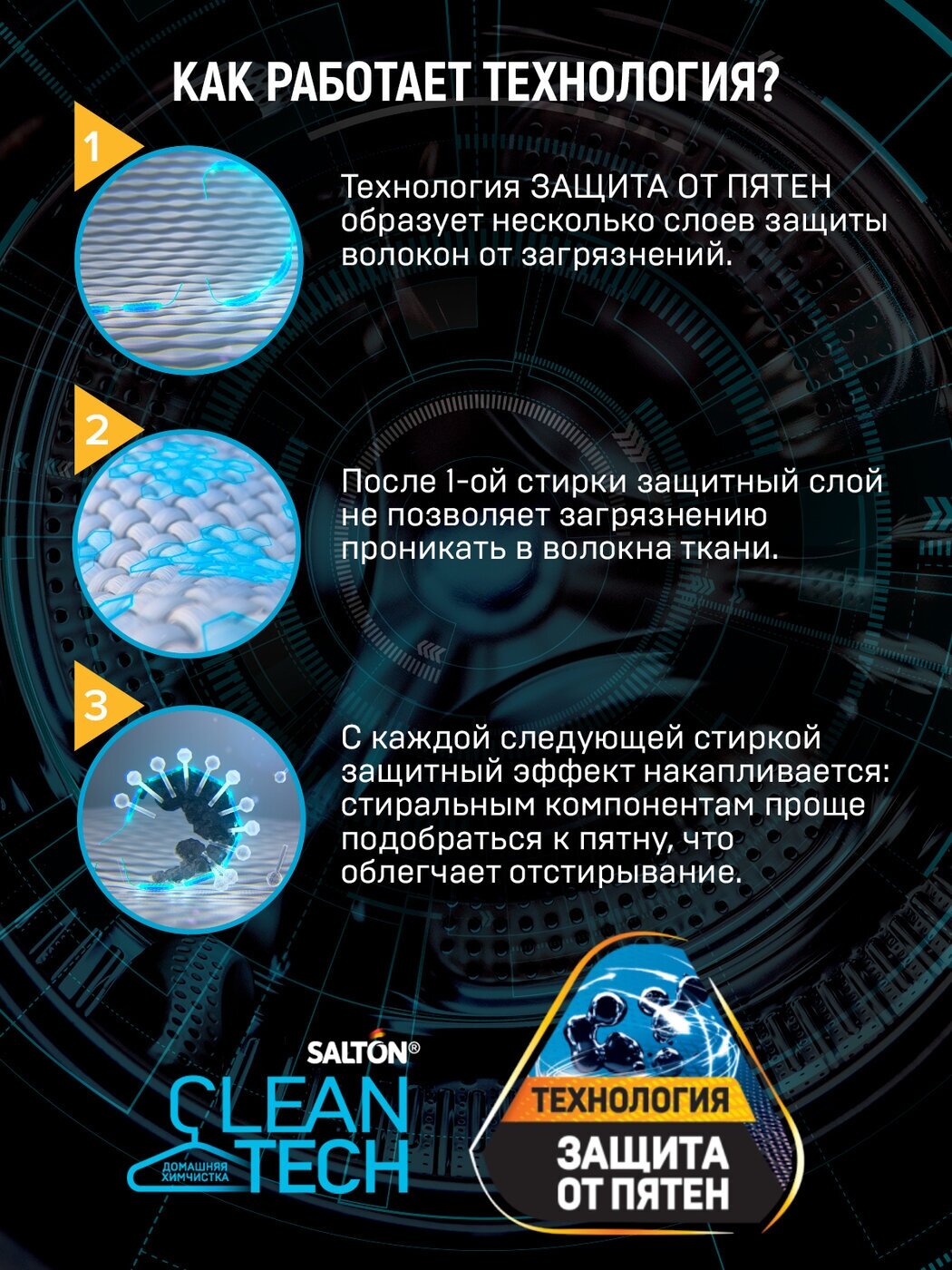Посадить пятно на одежду - легко, отстирать - порой целая задача, тратить время на которую не хочется.Универсальный гель для стирки Salton CleanTech - уникальный продукт на рынке стирки, который не только эффективно отстирывает, но и защищает от загрязнений. Инновационная технология ЗАЩИТА ОТ ПЯТЕН покрывает ткани защитным слоем, который не позволяет пятнам проникать глубоко в волокна ткани и значительно облегчает их последующее отстирывание. Защитный эффект накапливается с каждой стиркой.Благодаря Ингибитору переноса красителей, Гель для стирки белого белья Salton CleanTech подходит и для цветного белья, и для черного белья, надежно защищая ткани от изменения цвета и позволяя одновременно стирать вещи разных цветов. Универсальное средство для стирки Salton CleanTech содержит комплексоны, которые смягчают жесткую воду. Все это позволяет вам использовать меньше вспомогательных средств для белого белья.Не читайте про инновации, используйте их в своем повседневном уходе за одеждой с Универсальным гелем для стирки Salton CleanTech.