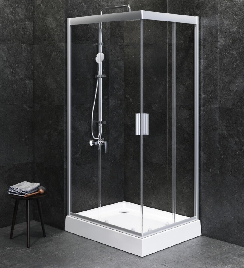 Предусматривает универсальную установку. Форма у него прямоугольная. Угловая конструкция позволит экономить место в комнате. В конструкции изделия шириной 800 мм и глубиной 1000 мм используется прозрачное стекло толщиной 5 мм. Оно придает душевому уголку выразительность.