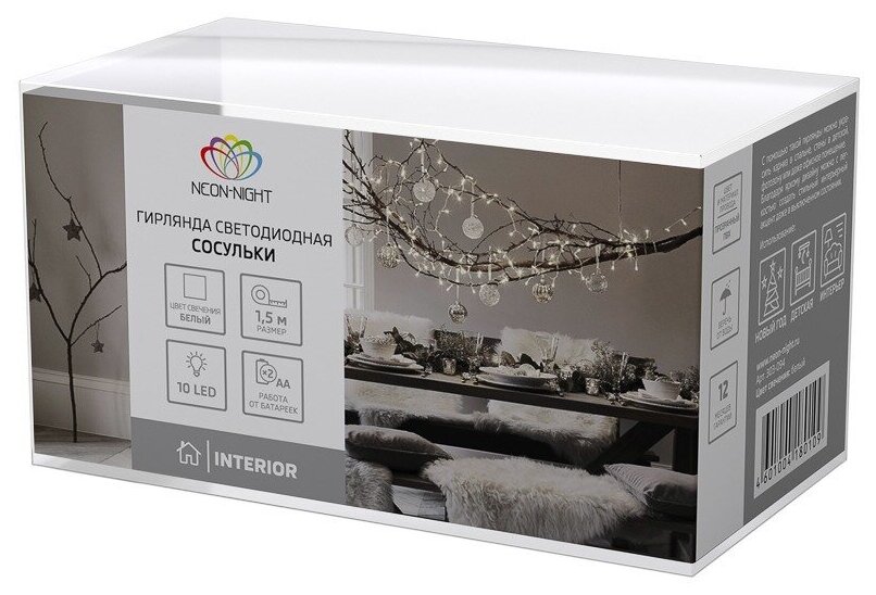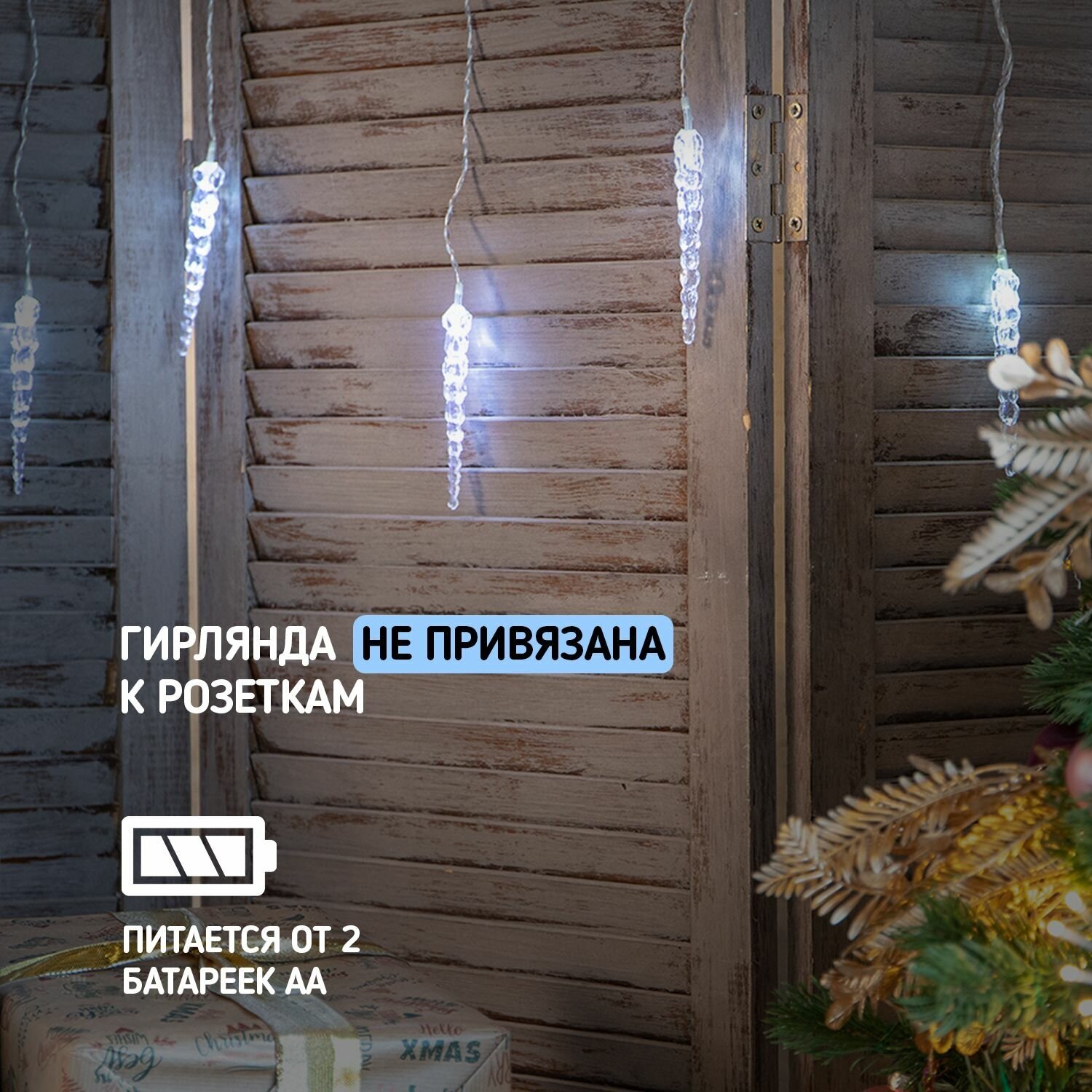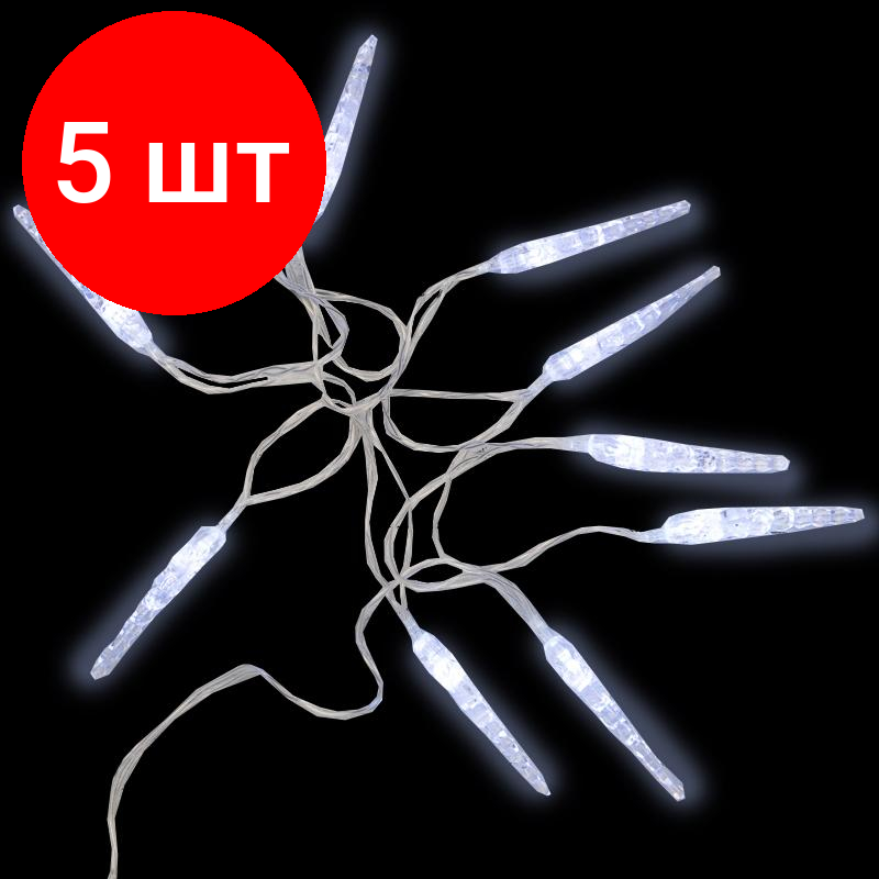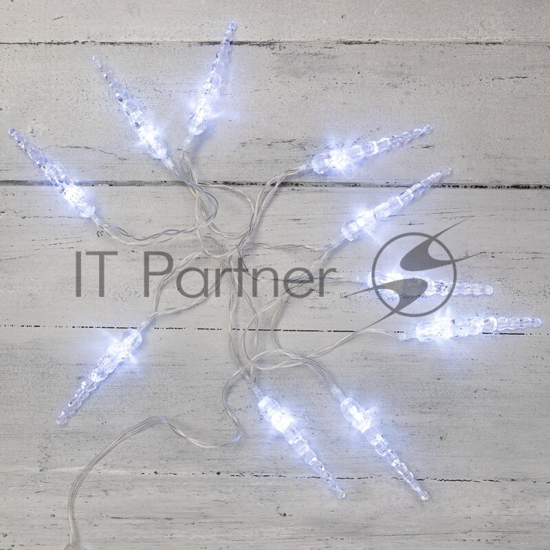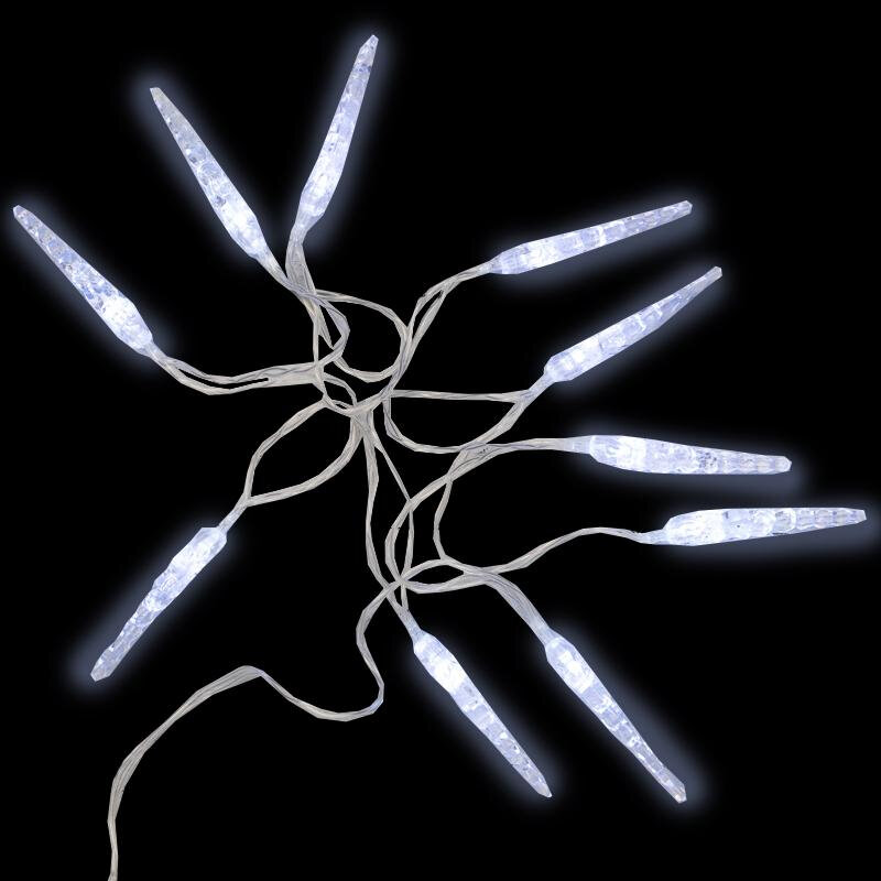 Светодиодная гирлянда «Сосульки» украшена пластиковыми насадками в виде ледяных сосулек, которые ярко подсвечиваются диодами. Украшение способствует созданию магической атмосферы праздника и помогает эффектно оформить интерьер. 10 сосулек расположены на расстоянии 16 сантиметров друг от друга, в качестве основы используется электрический кабель в надежной изоляции из прозрачного ПВХ. Диоды белого свечения питаются от двух батареек АА, которые помещаются в небольшой блок на конце кабеля. Безопасное изделие на батарейках — прекрасный вариант для оформления детской комнаты.