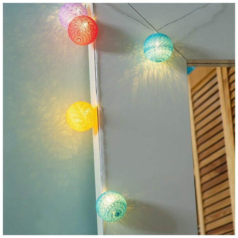 Тайские фонарики "Фейерверк" с 10 шариками из разноцветных ниток относятся к оригинальному варианту оформления элементов интерьера. Могут использоваться как новогодний декор или в качестве украшения детской комнаты. Светодиоды с теплым сиянием не нагреваются и минимально расходуют электроэнергию.