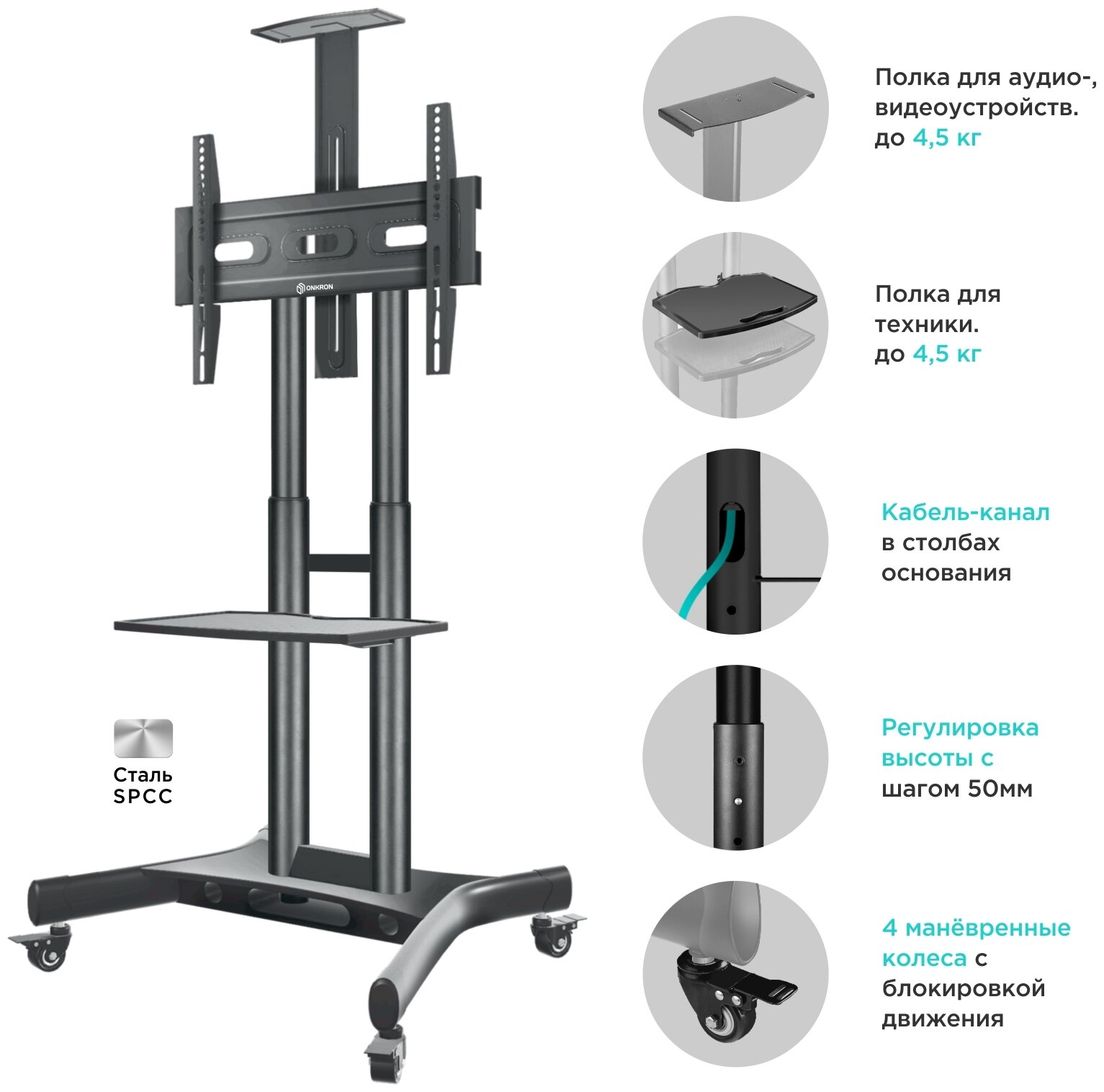 Мобильная стойка Onkron предназначена для ТВ диагональю экрана от 40 до 70 дюймов (101,6–177,8 см).