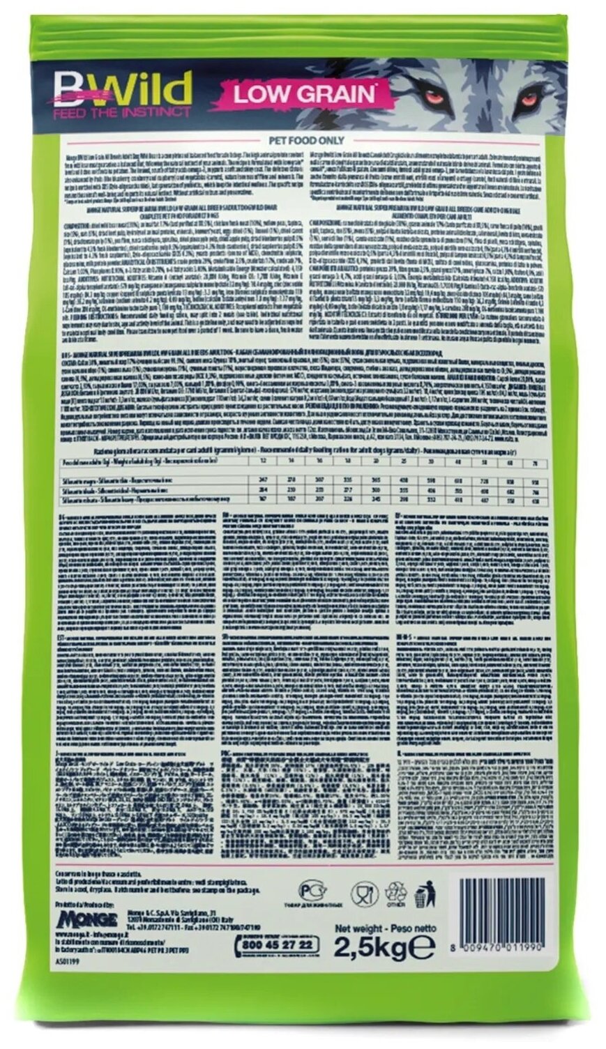 BWild Low Grain с мясом дикого кабана - полнорационный сбалансированный корм из мяса дикого кабана для собак всех пород. Рацион разработан с высоким содержанием белка и с ограниченным количеством злаков, не содержит картофель. Оптимальный баланс Омега-3 и Омега-6 в составе корма чрезвычайно важен для поддержания красоты шерсти и здоровья кожи. Лесные ягоды и травы - источники питательных веществ, натуральной клетчатки и биологически активных компонентов. Наличие в рационе овощей и ягод увеличивает вкусовую привлекательность корма. Формула содержит Х.О.S., что помогает сохранить естественный баланс кишечной микрофлоры и способствует оптимальному усвоению питательных веществ.