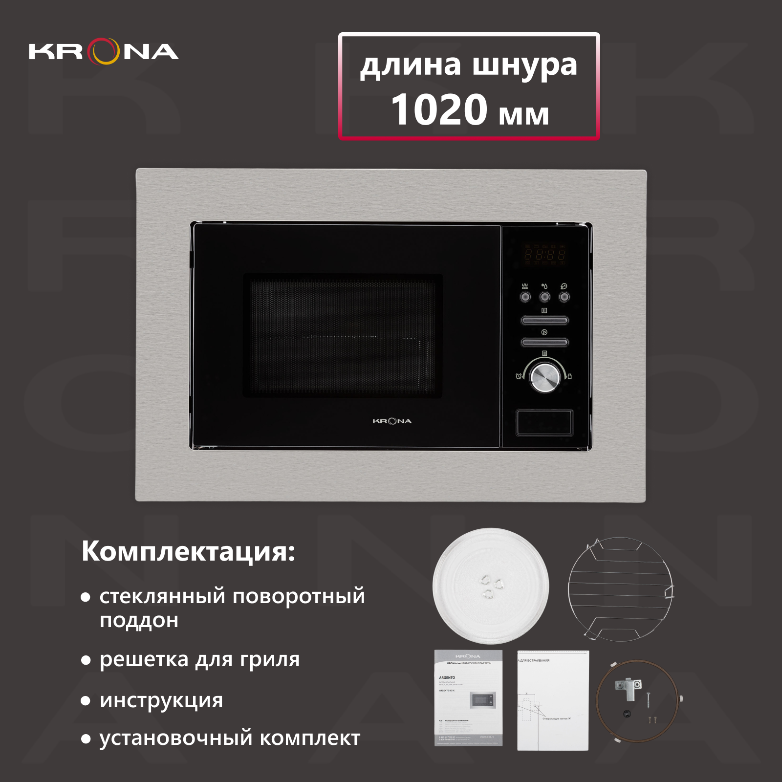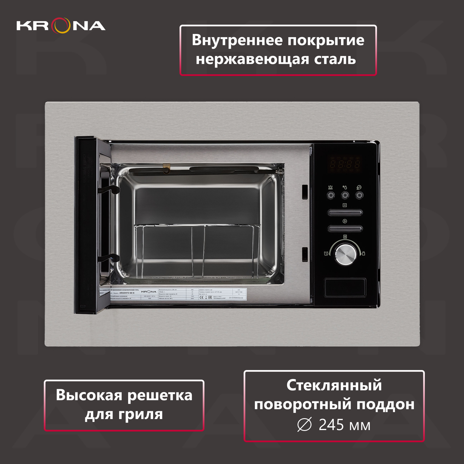 Встраиваемая микроволновая печь ARGENTO шириной встраивания 60 см выполнена в современном стиле из нержавеющей стали и черного закаленного стекла. Модель оснащена удобным управлением, 8 рецептами автоприготовления, разморозкой по весу или по времени, а также электрическим грилем. В комплекте поставки модели идут стеклянный поворотный поддон и решетка для гриля.