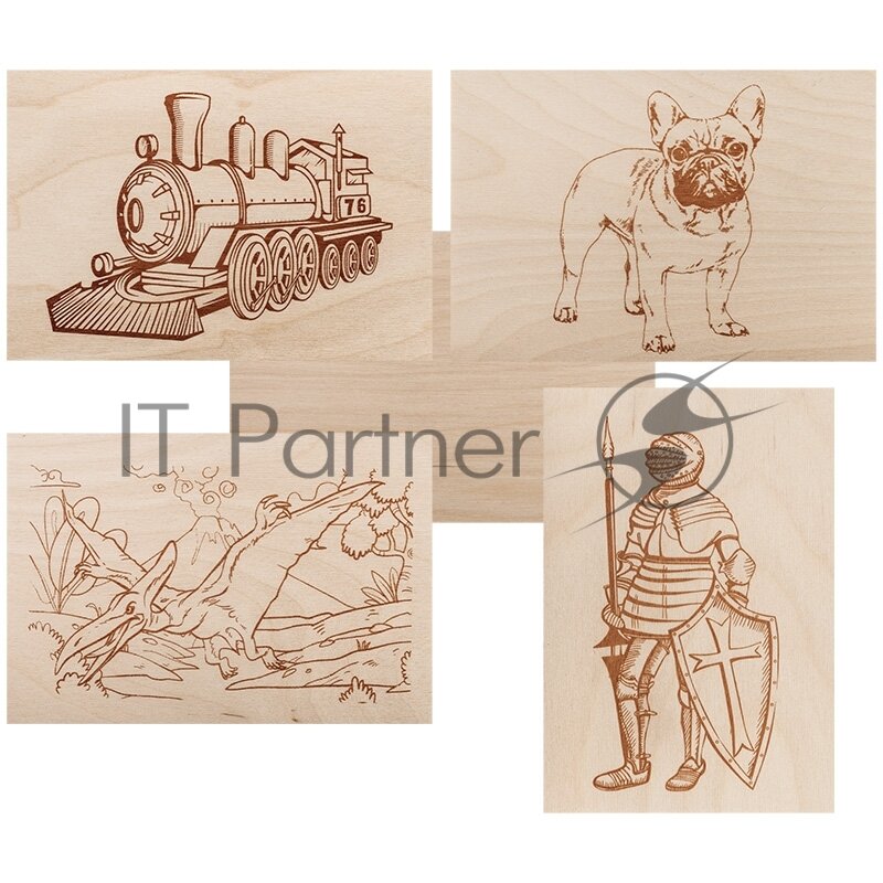 Выжигание по дереву станет любимым занятием как для ребенка, так и для взрослого. Набор изготовлен из качественной шлифованной фанеры и относится к эко-игрушкам. Обладает всеми сопутствующими достоинствами: естественный цвет и запах положительно влияют на психику; фактура, текстура и плотность дерева передают тактильные ощущения и играют важную роль в познании мира, дают ребенку реальные представления о вещах и материалах. На 4 доски нанесены рисунки с различным уровнем сложности: воин, динозавр, собака, поезд + 1 доска без эскиза для самостоятельного творчества. Для занятий Вам понадобится прибор для выжигания. Оформить работу можно акварельными и гуашевыми красками, цветными карандашами и фломастерами. Размеры доски: 148х210 см (формат А5). Толщина: 3 мм.
