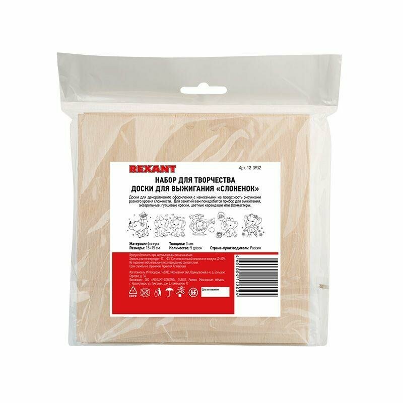 Выжигание по дереву - увлекательное и оригинальное хобби как для ребенка, так и для взрослого. Дощечки полностью готовы к работе: изделия изготовлены из качественной шлифованной фанеры и относятся к популярным эко-игрушкам, контуры картинок прорисованы специальной краской, не выделяющей вредных веществ. Доски для выжигания развивают внимательность, усидчивость, тренируют мелкую моторику рук, а также открывают широкие творческие горизонты. Достоинства: естественный цвет и запах положительно влияют на психику; натуральные материалы развивают вкус и эстетические качества; рисунки имеют разный уровень сложности. Для занятий Вам понадобится прибор для выжигания, акварельные или гуашевые краски, фломастеры или карандаши (по желанию). Состав набора «Слоненок»: 5 досок для выжигания. Размеры досок оптимальны и удобны для пользования: 15х15 см; толщина: 4 мм. Прикоснитесь к творчеству и подарите незабываемые эмоции с REXANT!