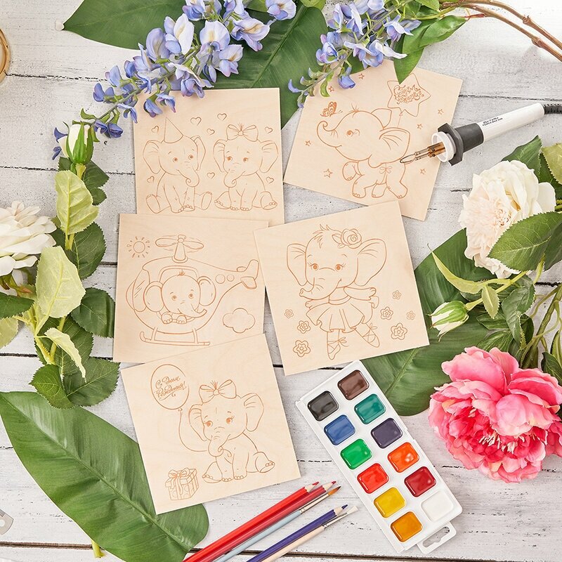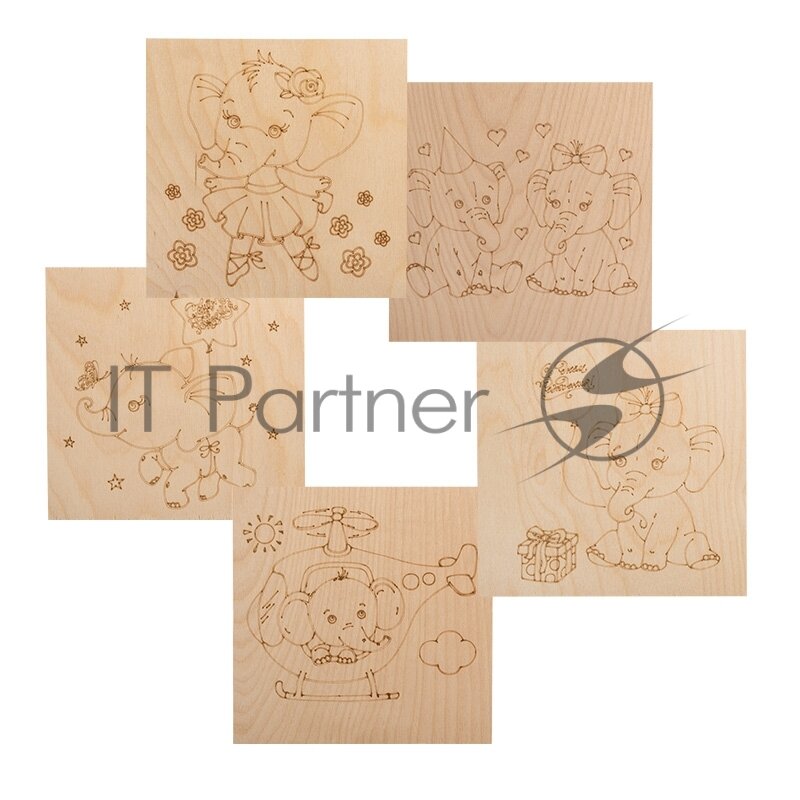 | Комплектация | 5 досок для выжигания сюжеты со слоненкомслоненок на лужайке, слонята на празднике, слоненок на шаре, слоненок с подарком, слоненок летчик |
