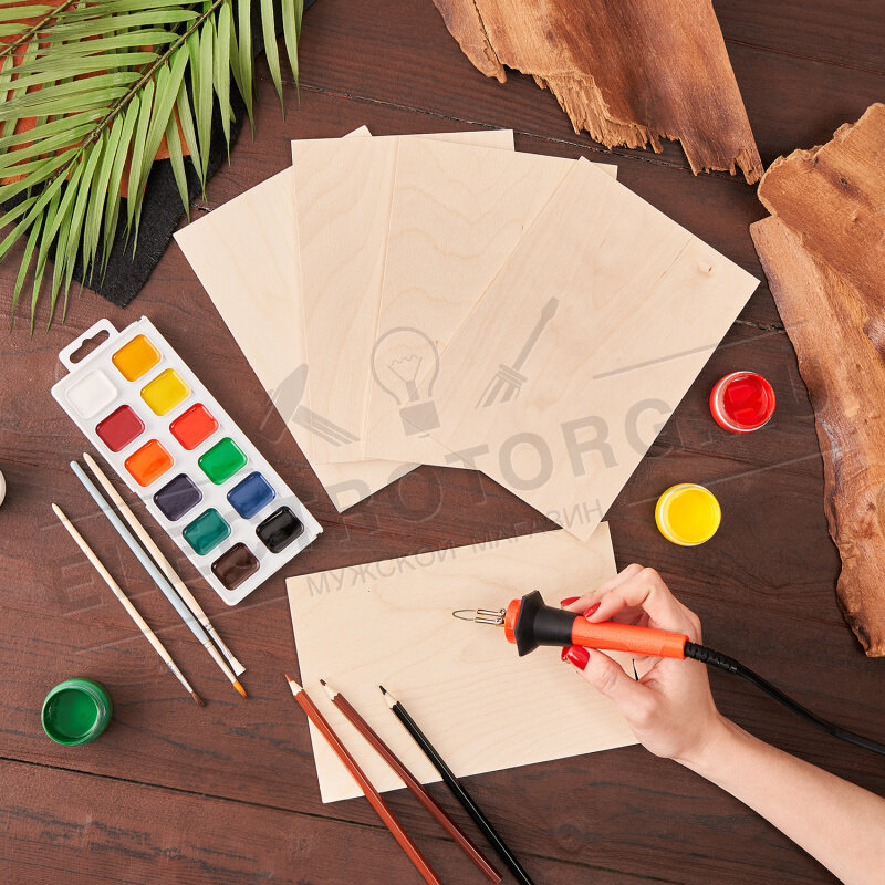 Выжигание по дереву – прекрасное хобби как для ребенка, так и для взрослого.Доски для выжигания по дереву изготовлены из качественной шлифованной фанеры и относятся к эко-игрушкам, обладают всеми сопутствующем достоинствами:- естественный цвет и запах положительно влияют на психику;- фактура, текстура и плотность дерева передают тактильные ощущения и играют важную роль в познании мира, дают ребенку реальные представления о вещах и материалах;- натуральные материалы развивают вкус и эстетические качества.На доске рекомендуется заранее нарисовать картинку простым карандашом (также желаемую картинку можно нанести с помощью оригинала рисунка и копирова́льной бумаги – копи́рки). Для занятий вам понадобится прибор для выжигания, также оформить работу можно акварельными и гуашевыми красками, цветными карандашами и фломастерами.У детей развивается мелкая моторика пальцев, внимательность, усидчивость и аккуратность. У ребенка формируются навыки рисования и фантазия, основы работы с выжигателем.Состав набора: 5 двухсторонних досок (свободных от эскиза) для самостоятельного творчества. Основные характеристики:Размеры доски: 148х210 см (формат А5); толщина: 3 ммСтрана-производитель: Россия