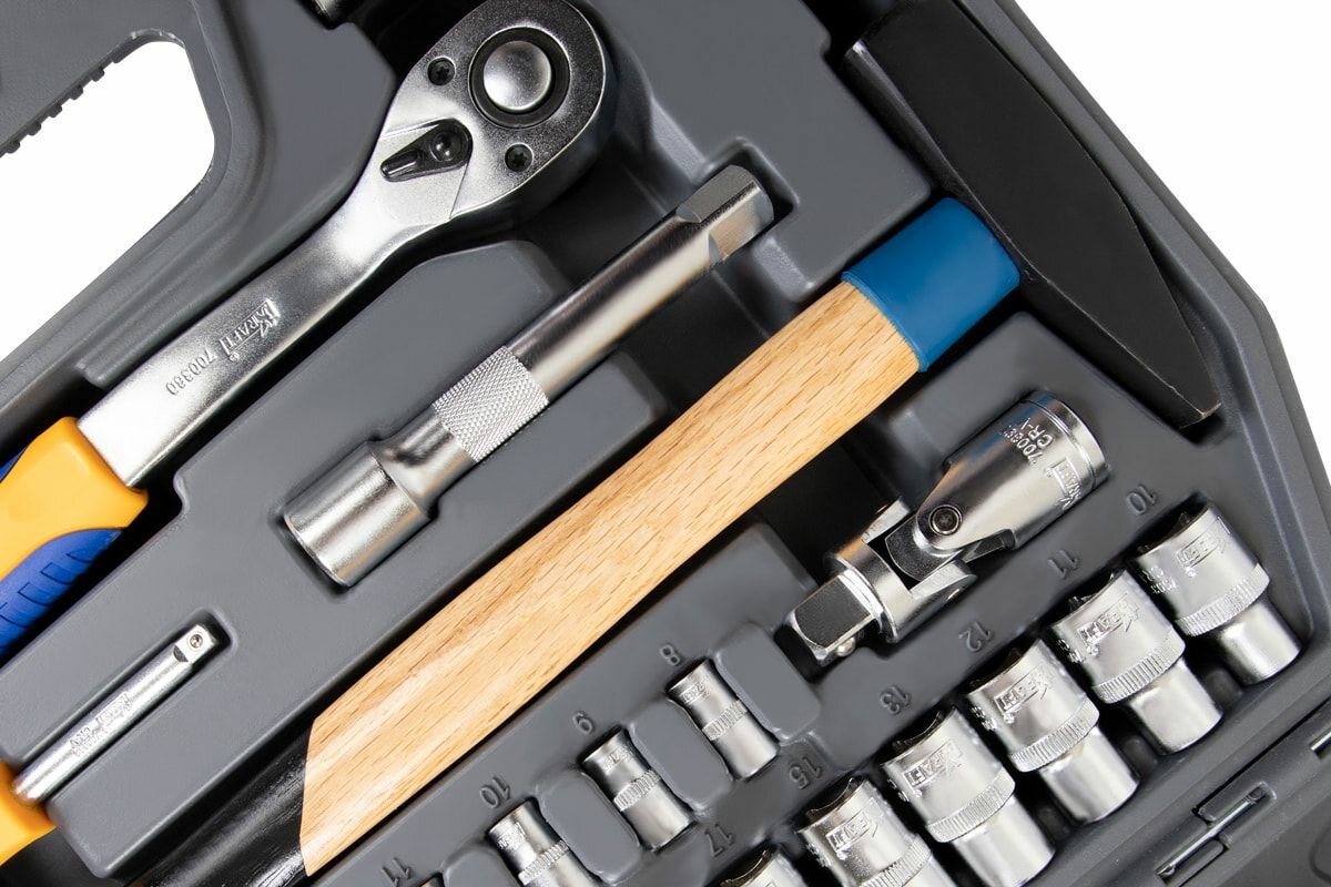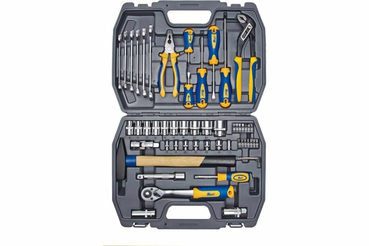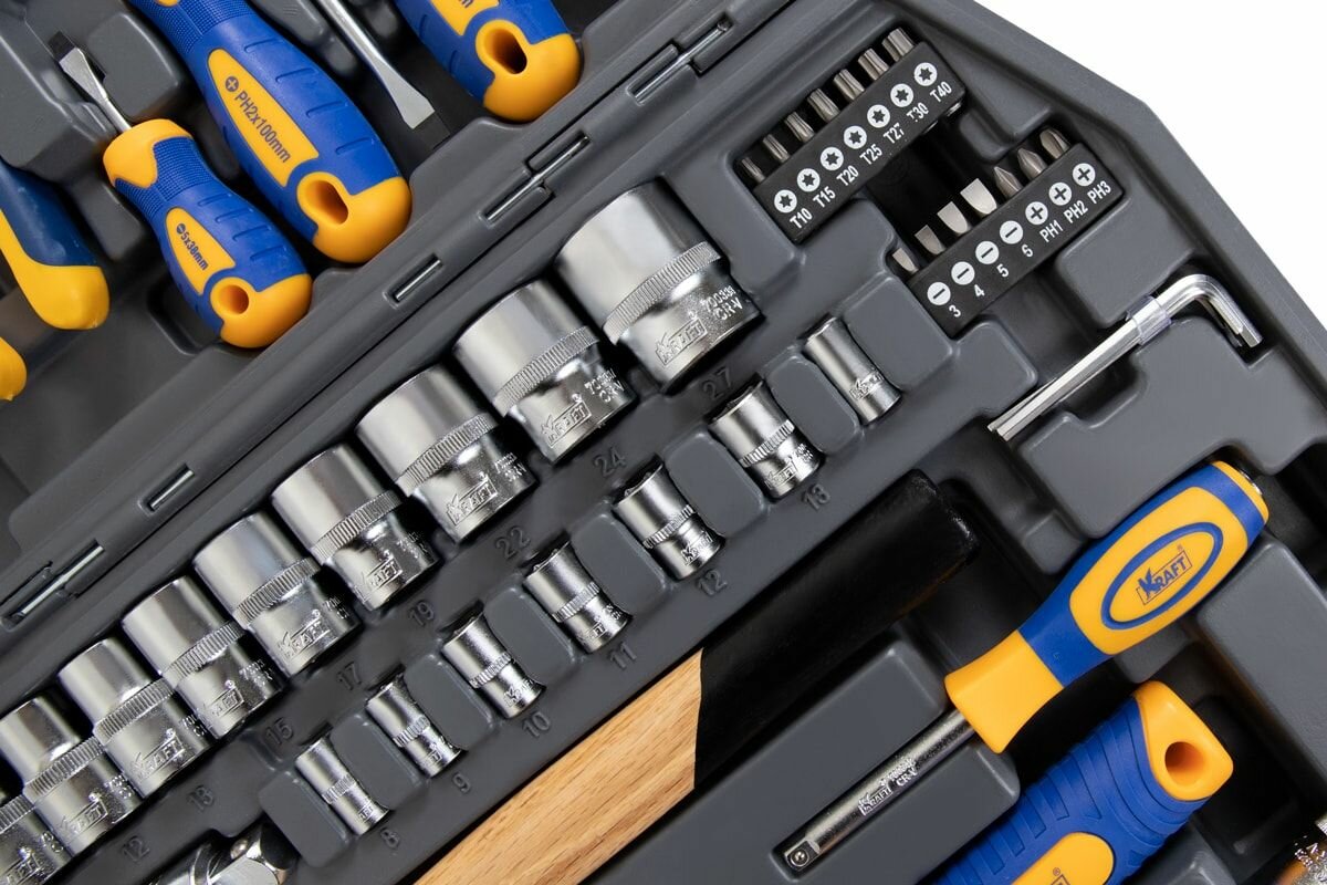 Многоцелевой набор инструмента Kraft, созданный для обеспечения рабочего процесса механика по обслуживанию продукции машиностроения, в первую очередь, автомобильной техники. Расширенная комплектация позволяет обслуживать резьбовые детали с шестигранными внешними рабочими поверхностями.