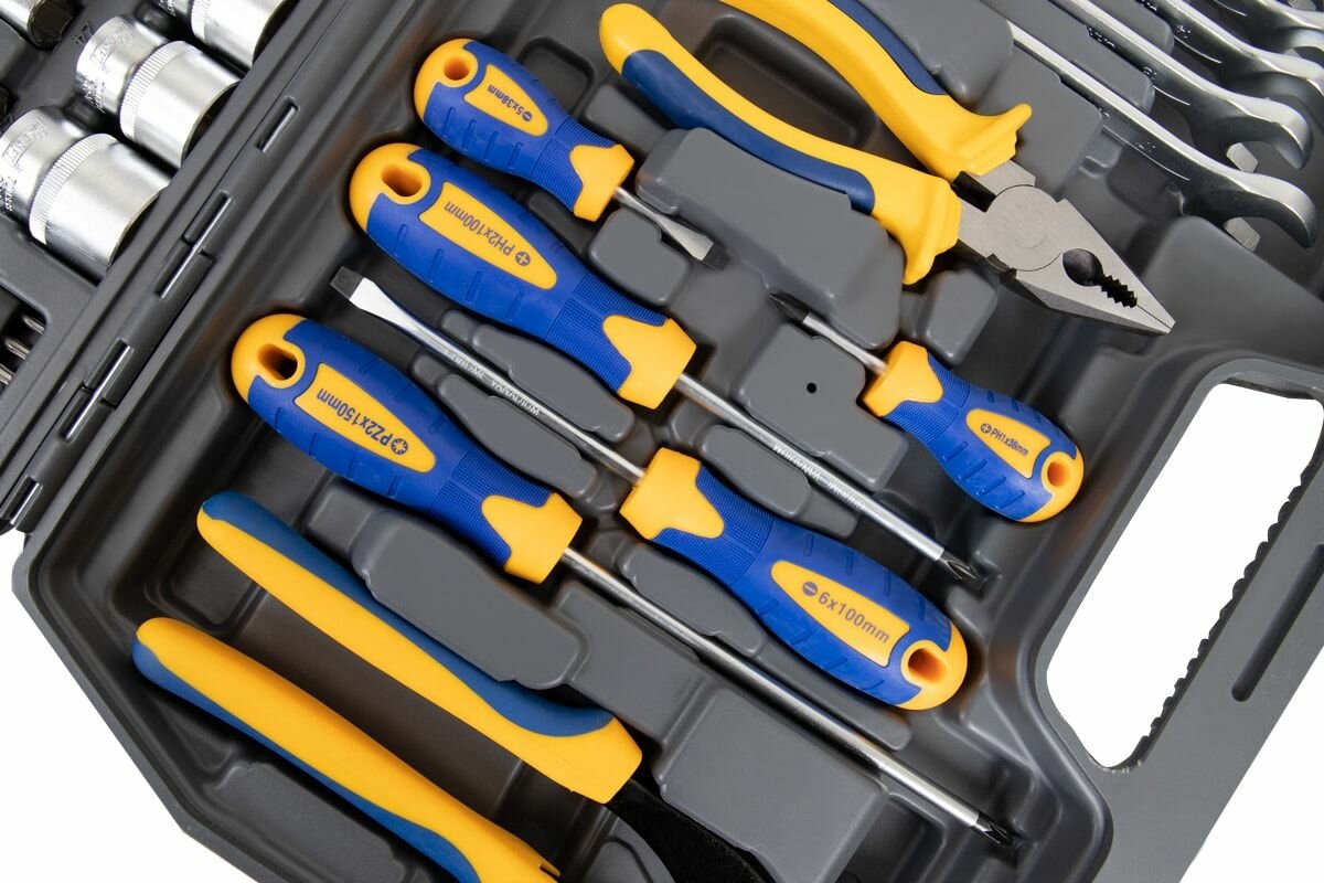 | Комплектация | бокорезы; клещи; ключ разводной; ключи гаечные; ключи имбусовые (шестигранные); молоток; отвёртки; пассатижи; плоскогубцы; трещотка; биты; торцевые головки; удлинитель для головок; шарнир карданный для головок |