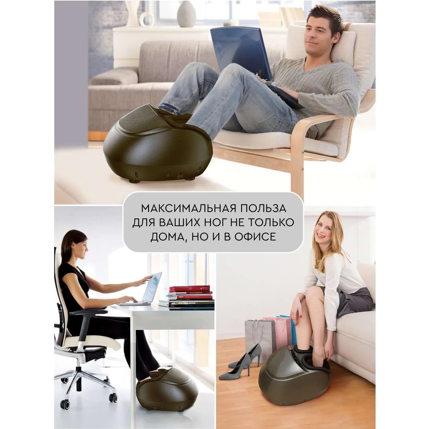 Сочетает 2 вида комфортного массажа ног: роликовый массаж Шиацу и воздушно-компрессионный массаж ступней и лодыжек. Незаменимый помощник в борьбе с усталостью и стрессом. Помогает глубоко промассировать стопы, снять ощущение тяжести в ногах, расслабить мышцы, улучшить кровообращение, повысить общий тонус организма и улучшить самочувствие за счет проработки рефлекторных зон на стопах. За счет всестороннего сжатия усиливается эффект воздействия массажных роликов на биологически-активные точки на стопах. Укрепляет мышцы и предотвращает накопление токсинов, делая ноги здоровыми и красивыми. 3 скорости разминающего роликового массажа Шиацу и 3 уровня интенсивности компрессионного массажа. Все функции регулируются на удобной интегрированной панели управления со световыми индикаторами. Две установки таймера 15 и 30 мин. Функция инфракрасного подогрева. Качественный прочный пластик корпуса, стильный дизайн. Устойчивые ножки и удобное хранение шнура питания. Съемные тканевые чехлы на молниях.