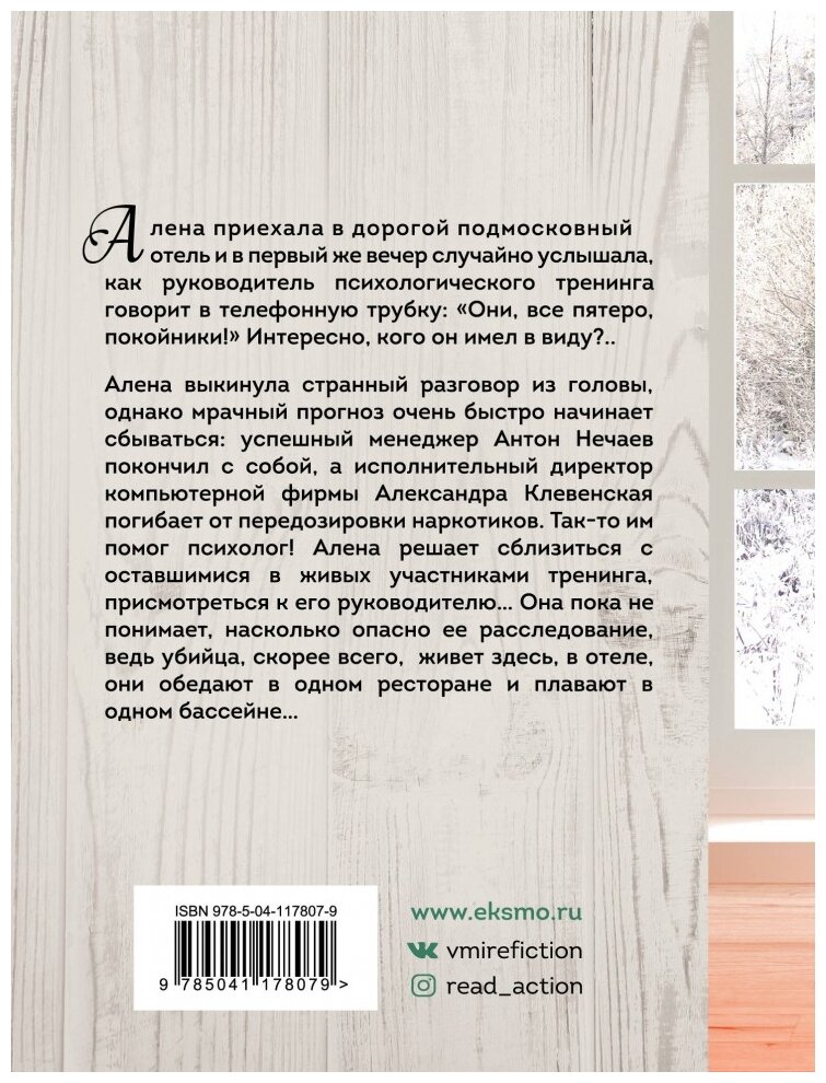 Алена приехала в дорогой подмосковный отель и в первый же вечер случайно услышала, как руководитель психологического тренинга говорит в телефонную трубку: "Они, все пятеро, покойники!" Интересно, кого он имел в виду?.. Алена выкинула странный разговор из головы, однако мрачный прогноз очень быстро начинает сбываться: успешный менеджер Антон Нечаев покончил с собой, а исполнительный директор компьютерной фирмы Александра Клевенская погибает от передозировки наркотиков. Так-то им помог психолог! Алена решает сблизиться с оставшимися в живых участниками тренинга, присмотреться к его руководителю… Она пока не понимает, насколько опасно ее расследование, ведь убийца, скорее всего, живет здесь, в отеле, они обедают в одном ресторане и плавают в одном бассейне…