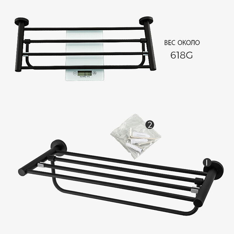 Цвет: черный матовый. Материал: нержавеющая сталь. Размеры (ШхВхД): 60х14,9х22 см. Монтаж: настенный. В комплекте поставки: полка для полотенец, полотенцедержатель, набор креплений. Страна производства: Россия. Гарантия: 1 год.