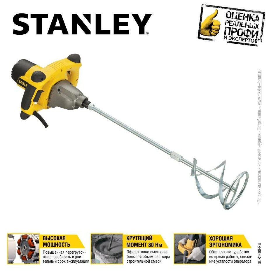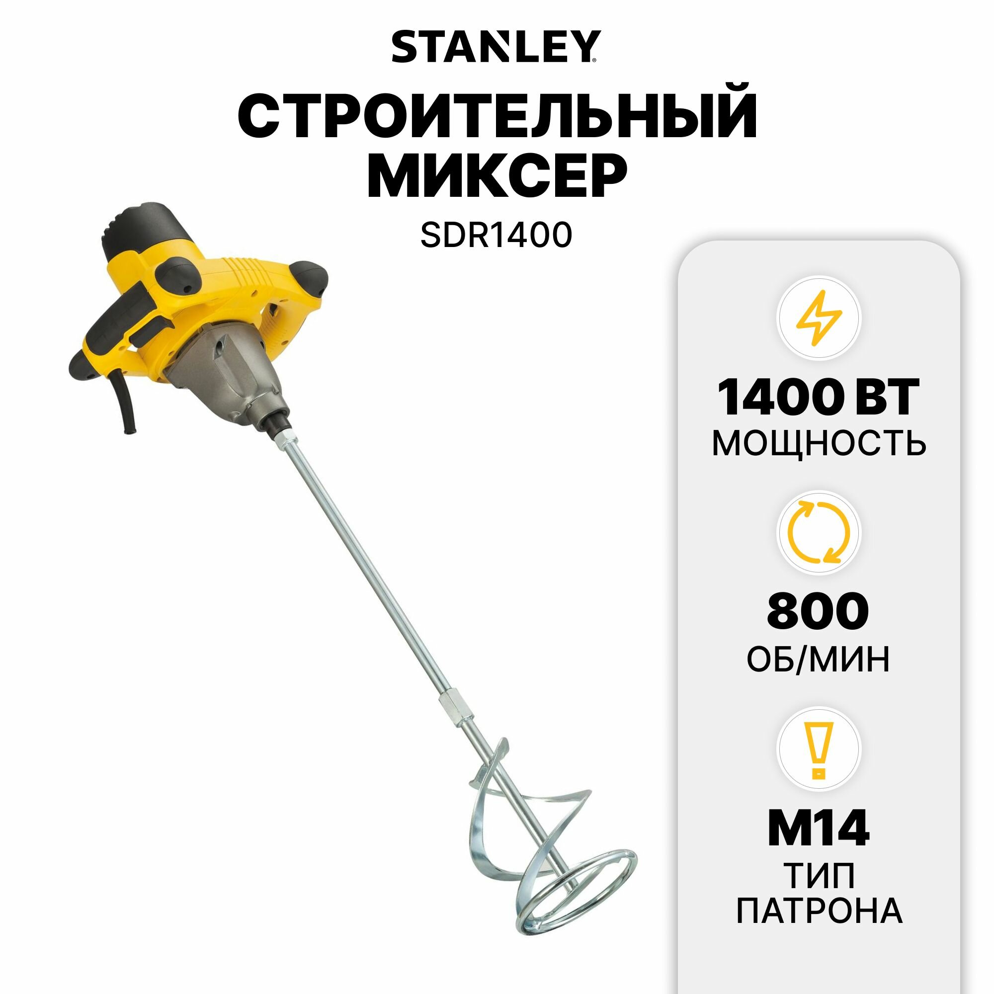 Миксер Stanley SDR1400 используется для смешивания цементных смесей, клея, строительных растворов. Особенности и преимущества: Рукоятки обеспечивают надежный хват. Патрон облегчает смену миксера. Возможно регулировка скорости миксера. Функция плавного пуска облегчает начало работы с инструментом.