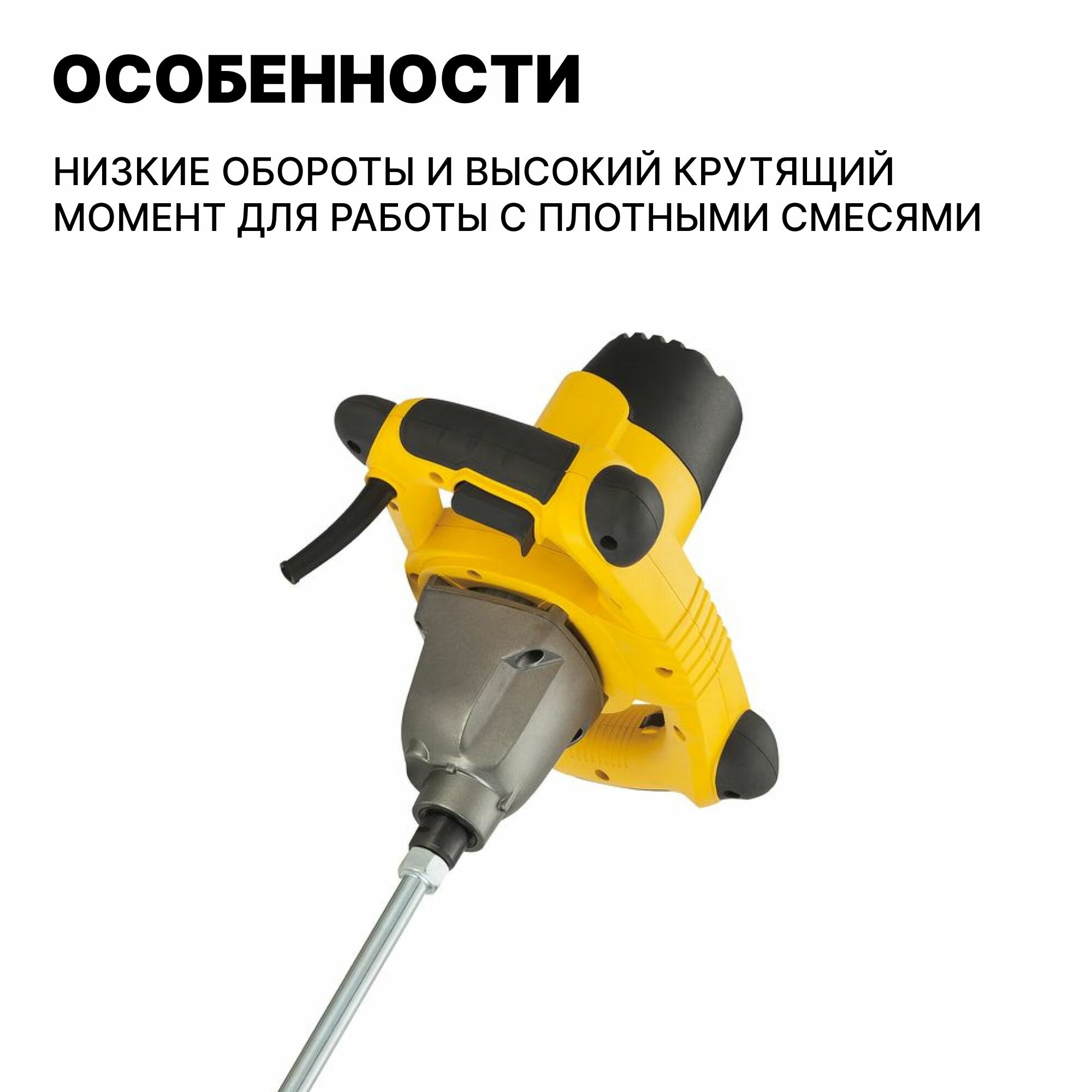 Особенности и преимущества: Двигатель мощностью 1400 Вт легко смешивает жидкости высокой вязкости для приготовления различных составов и растворов. Низкооборотистый, двухскоростной металлический редуктор позволяет выдавать высокий крутящий момент при выполнении различных операций. Две скорости работы позволяют контролировать образование однородной смеси, а также избежать разбрызгивания и образования воздушных пузырьков.