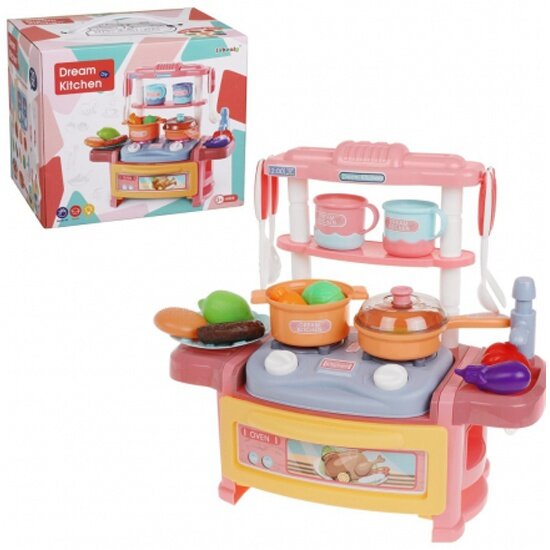 В комплекте есть сборный кухонный модуль со светозвуковыми эффектами и игрушечные аксессуары: 1 яичница, 1 стейк, 1 морковь, 2 пирожных, 1 капуста, 1 лайм, 2 чашки, 1 краник, 1 сковорода, 2 тарелки, 1 кастрюля, 1 крышка и 4 приспособления для готовки.