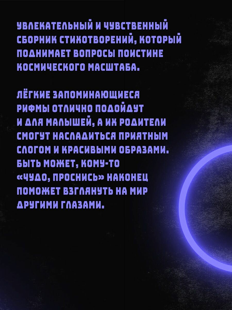 Увлекательный и чувственный сборник стихотворений, который поднимает вопросы поистине космического масштаба. Лёгкие запоминающиеся рифмы отлично подойдут и для малышей, а их родители смогут насладиться приятным слогом и красивыми образами. Быть может, кому-то «Чудо, проснись» наконец поможет взглянуть на мир другими глазами.
