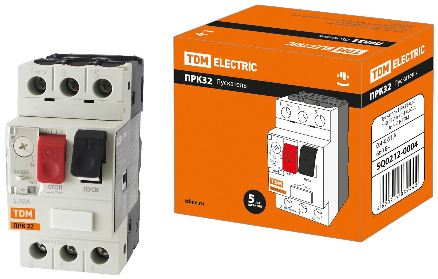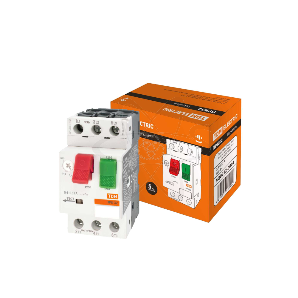 Пускатель TDM ПРК32-0,63 In=0,63A Ir=0,4-0,63A Ue 660В, служит для проведения тока в нормальном режиме, отключение тока при коротких замыканиях, перегрузке или обрыве фазы, оперативное включение и выключение нагрузки.