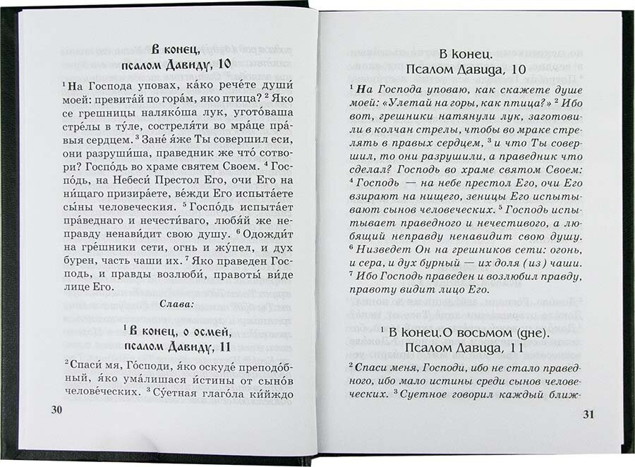 В эту книгу помещены тексты Псалтири на церковнославянском и русском языках. В отличие от Синодального перевода Библии с церковнославянского, русский текст этой Псалтири переведен с греческой Септуагинты (LXX) и точно соответствует Псалтири, используемой в православном богослужении. Перевод на русский язык, выполненный замечательным русским ученым П.А. Юнгеровым (1856-1921), был одобрен Святейшим Синодом, а при современном переиздании получил благословение Святейшего Патриарха Алексия II. Псалтирь может быть использована при домашнем молитвословии.