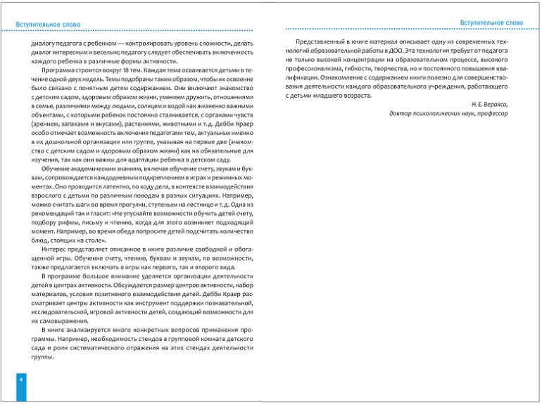 Серия книг, созданных коллективом авторов под руководством Д. Краер, содержит тщательно разработанную технологию работы с детьми 3–5 лет, основанную на многолетнем опыте наблюдения за работой ДОО и оценке их образовательной среды по Шкале для комплексной оценки качества образования в дошкольных образовательных организациях (ECERS).
